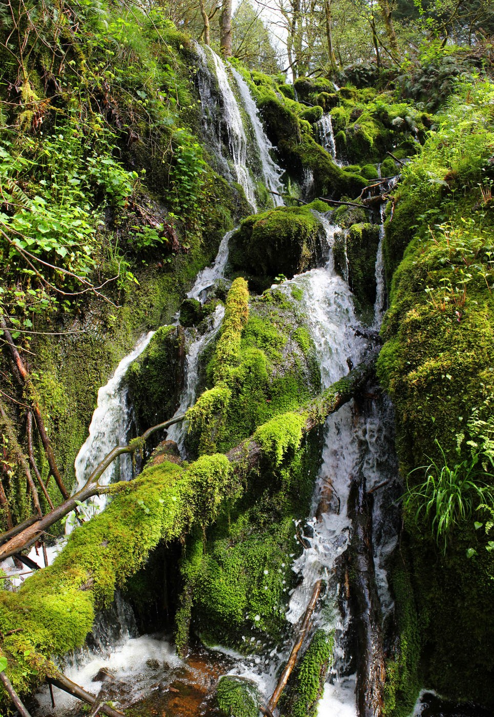 I have been hiking all over Cougar Mountain for 20 years and for some reason have never seen Far Country Falls before. The WTA Trail News email this morning had an article on Waterfalls and Far Country was featured so I thought that I'd check it out. I decided to approach from the lower Licorice Fern trailhead to make the journey a little longer and lonelier than approaching from Red Town. The trailhead is on SE 112th just off of May Valley Road. The trailhead is an obscure, but signed turnout on the right just after 112th turns left to become 169th. This section of Licorice Fern trail is seldom used and very pretty. It is in a deep mossy valley with lots of bright green understory vegetation and nice mature trees. At 1.2 mi you cross SE Licorice Way and pick up the Licorice Fern trail on the other side. There are still a fair number of Trillium in bloom. The Licorice Fern trail intersects the Indian Trail at 1.5 mi and near the Indian Trail trailhead. You could start at the Indian Trail trailhead but then you would miss the best part of the trail and some exercise. At 2 mi is the turnoff for the Far Country Trail(not the falls). 0.1 mi further is the signed turnoff for the Far Country Falls. Right now the flow is pretty descent and the rocks are covered with moss. We also did a short side trip to Far Country Lookout to get a little more mileage and elevation gain. The view there is not great. 5 mi RT and 500 ft elevation gain. Map: