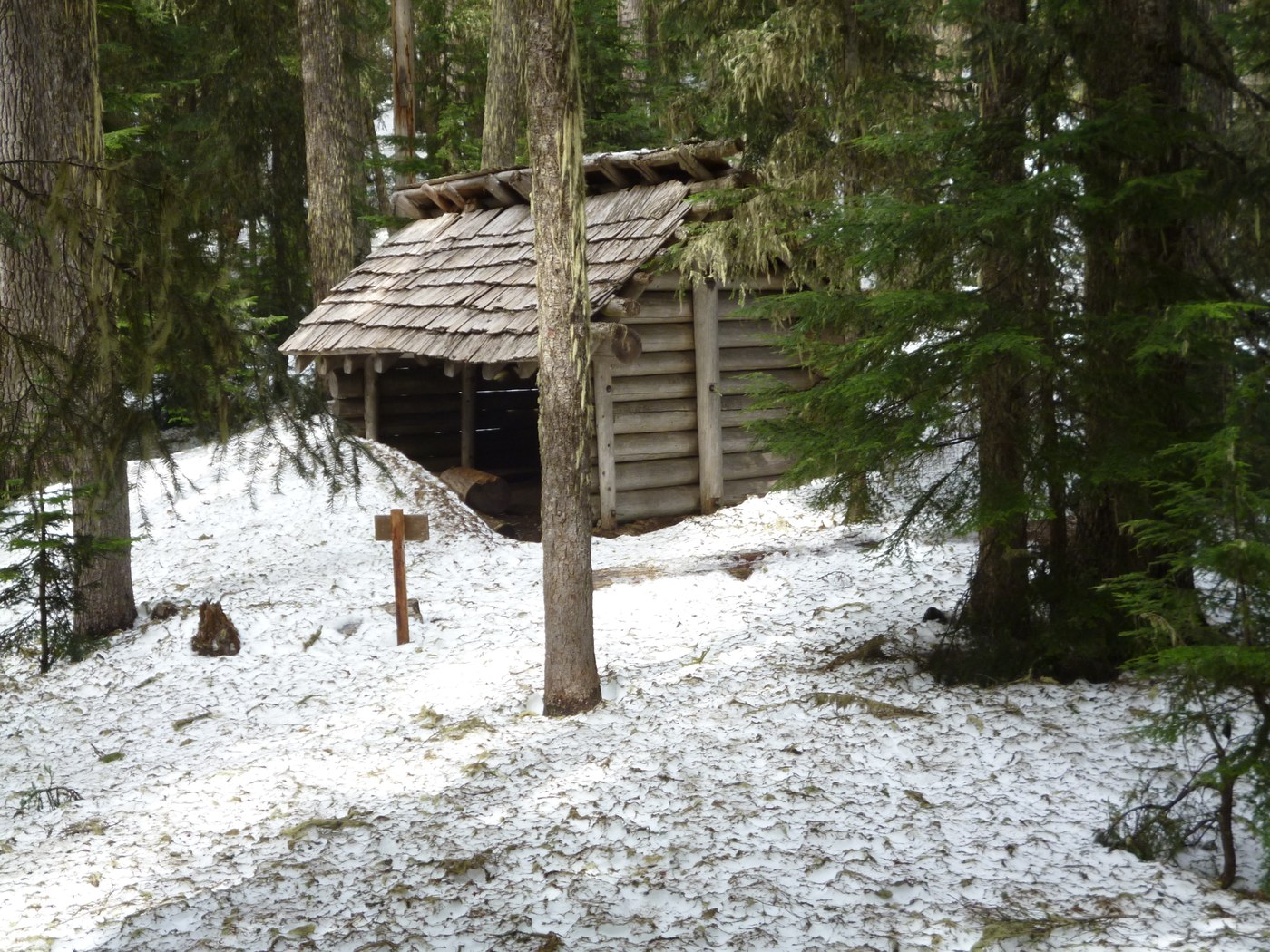 I proceeded another 1½ miles to the third overlook, with a much better view of Mt. Rainier. There was some snow on one portion of this section, beginning about 4150 elevation, although it was spotty and easily navigable. After enjoying lunch on the rocky outcropping, I decided to push on to see if I could reach the Shelter. It was farther than I expected – another 2 miles – and the snow soon got heavier. There were faint boot tracks to follow, but the trail was often obscure. I was glad I had microspikes. You could probably manage it without them, but it wouldn’t be easy. Nearing the Shelter, the snow was close to a foot deep in places, and I postholed several times. With all the snow and the routefinding, it took another 1½ hours to reach the Shelter. I had spent 4½ hours on the trail and had covered 7.9 miles and gained over 2600 feet elevation.