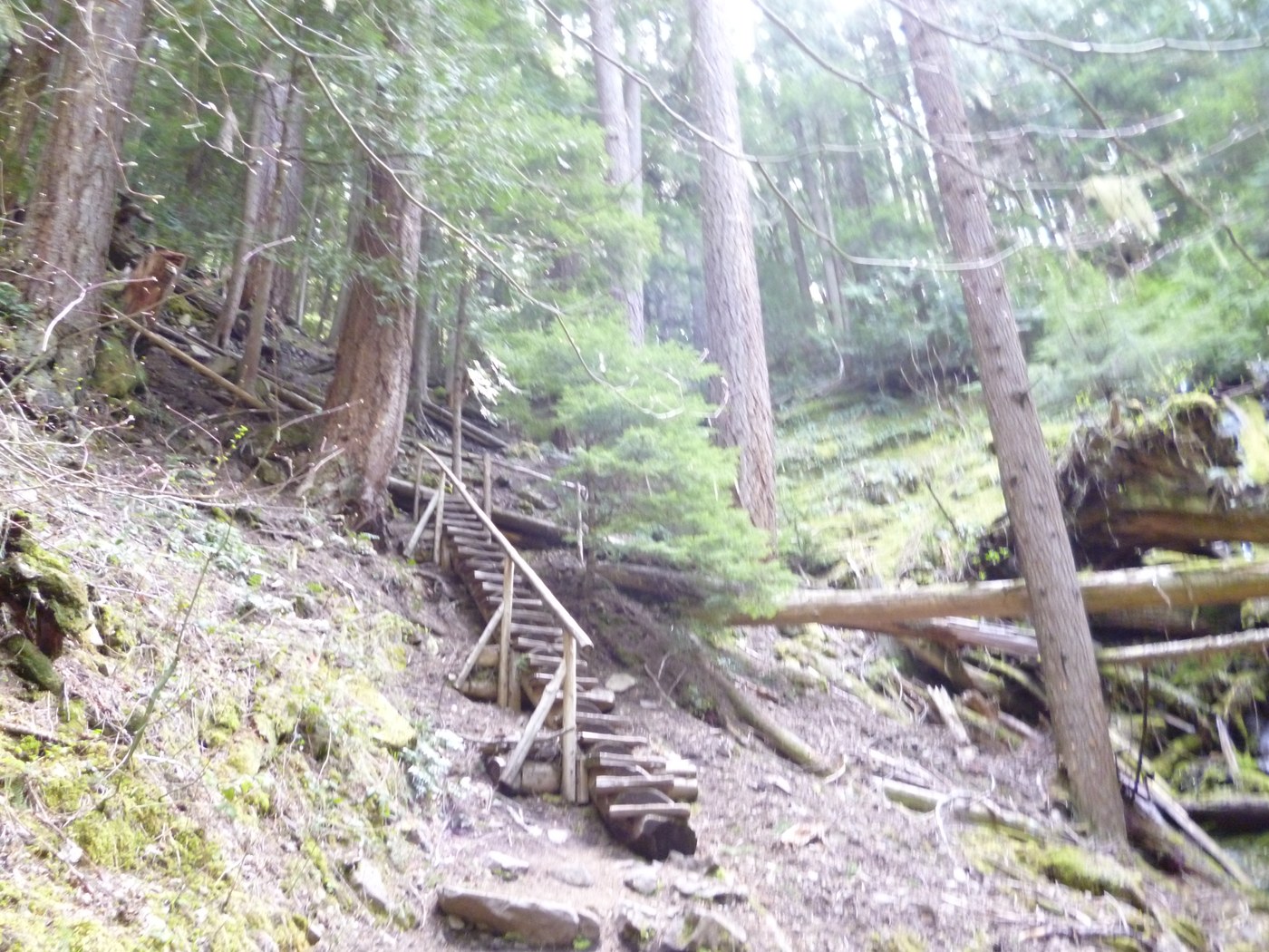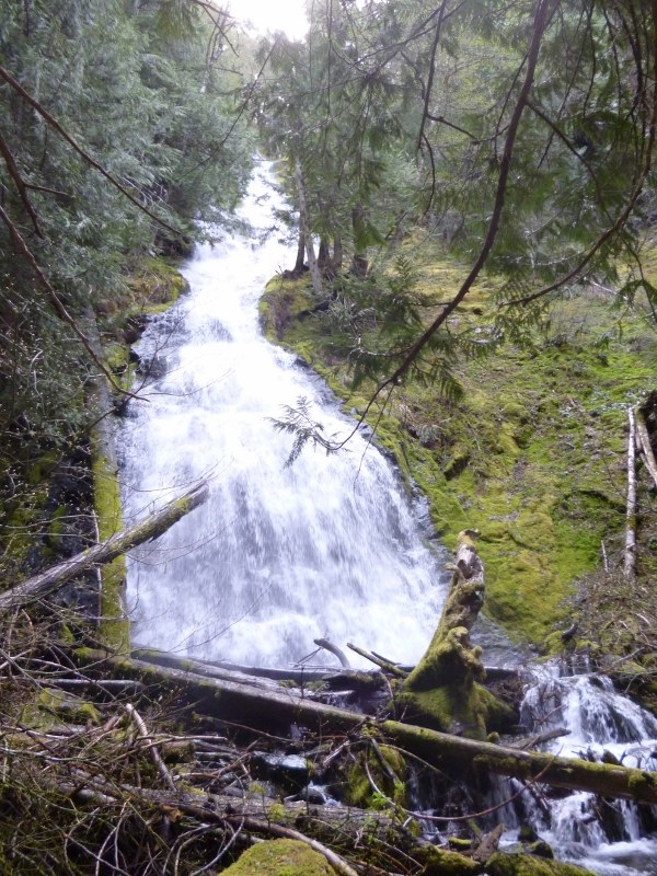 I parked at the Camp Sheppard lot, figuring that it would be about halfway between the two trailheads. I hiked up to the White River trail (#1199), then turned left and hiked about 1.3 miles to the junction with the Palisades Trail (#1198). I had stopped at the Enumclaw Ranger Station to ask about trail conditions, and had been told that the trail was in good condition and snow-free at least up to the second overlook. That proved to be accurate. Although the section to just above the falls is fairly steep – about 700 feet gain in a little over a mile – the only obstacle was the first stream crossing, where the rushing spring thaw made all the rocks wet and slippery. Trekking poles were useful here. From here the trail zig-zags up next to the falls, providing several great views before reaching the steps – about two dozen rough wooden steps leading to near the top of the ledge. Beyond this, there is a bridge with a few loose planks, but it’s perfectly safe if you’re careful.