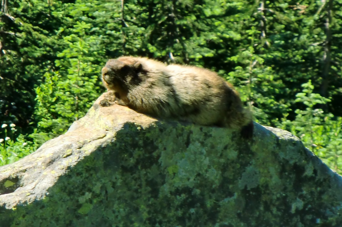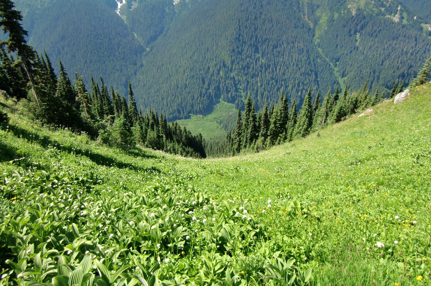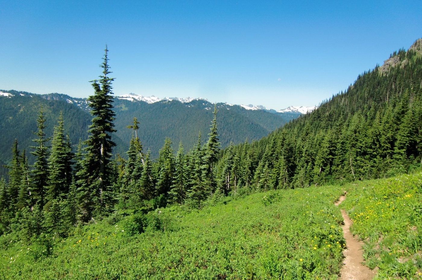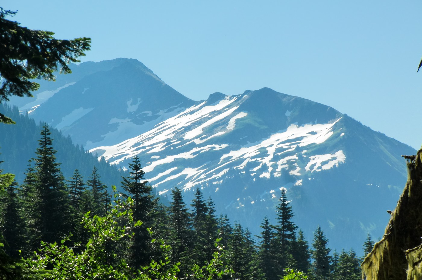 I knew this was going to be a hot one, so started out on the trail at 6:30am. The Mountain Loop Hwy Road was in great shape, but Road 49 had quite a few potholes. From the trailhead to Mackinaw Shelter I encountered no blowdowns, but there were clearings where the nettles were encroaching on the trail and had to semi-bushwhack. Found no issues with the trail after Mackinaw Shelter and the upper meadows were melted out with excellent displays of wildflowers. Hiked this last year at the same time and the melt out is way ahead of last year. I usually find a nice cool breeze at the higher elevations, but today the heat was brutal! The normally eager dog who wants to hike all day wanted to turn around about a quarter mile from the PCT junction, so do to the heat I turned around. The heat was not to bad under the forest canopy, but was very intense in the nettle fields. As usual the views in the upper meadows were outstanding the only drawback being the heat. Was back at the car by 2:45pm. If you make the extra effort to continue past Mackinaw Shelter you will not be disappointed.
