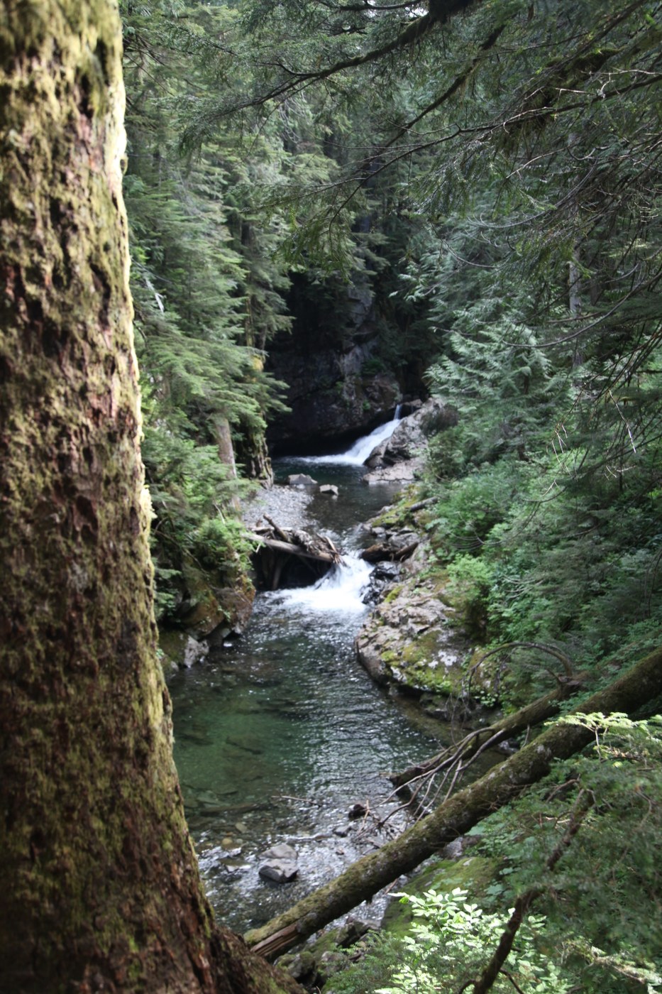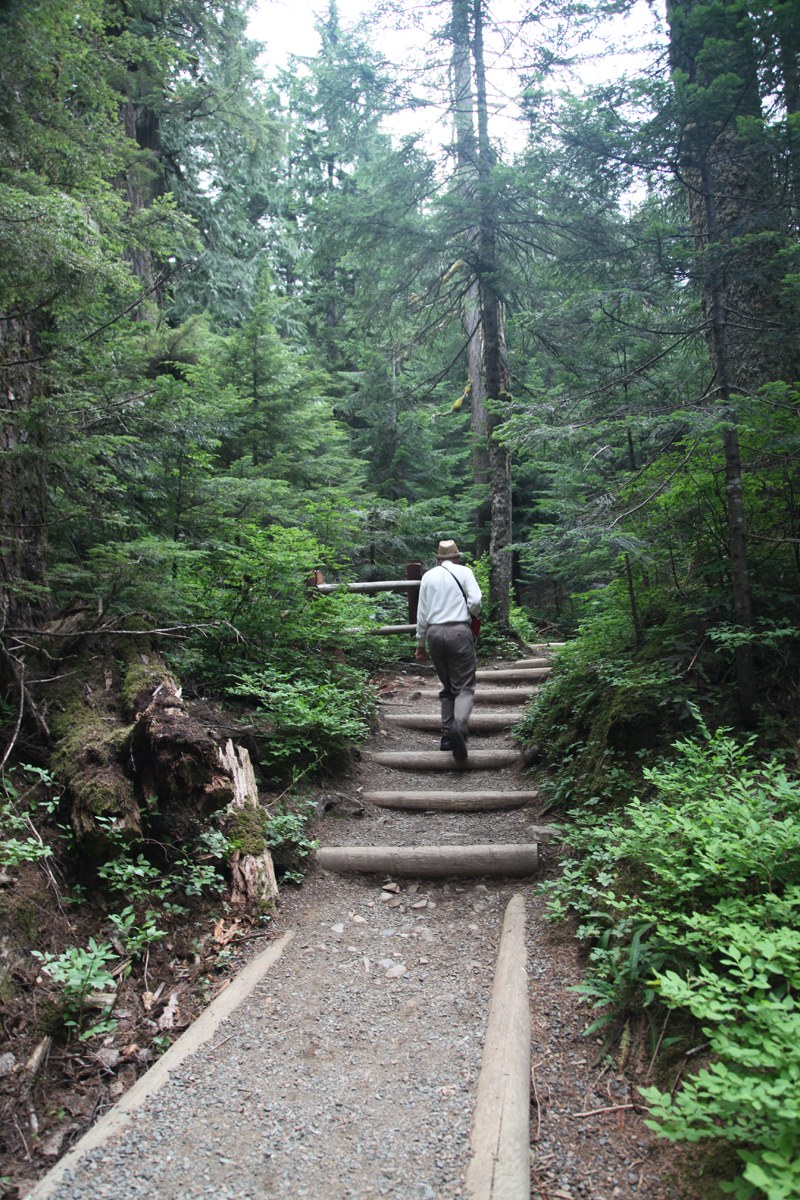 I was looking for an easy hike after an auto accident recently. This is an easy hike!! What impressed us was that we hit the trail at @ 8AM, hiked up to the falls and started back down before we encountered any other hikers, which is a rare fete these days. There is a lot to see on the way into this beautiful forest, including Devils club, beautiful boulders in the river, huge trees, deep pools and mini-waterfalls. Take your time on this one....it is short, but soooo much to see and experience. You don't want to miss a thing!! Trail was perfect, no bugs to speak of either.