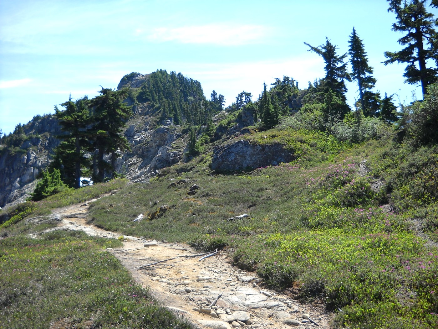 We started from the South Fork Sauk River bridge along the newly cleared Old Monte Cristo Wagon Road rather than the old rail grade at Barlow Pass. This winds through the forest on the north side of the river and adds about a mile to the trip into Monte Cristo- it's also about 200-300ft lower than the pass summit. It was gorgeous old forest and fairly secluded as few people are aware of this route yet- The road IS still under construction with one really nice bridge and two rough log crossings over small stream gullies. It comes out on an old forest road and joins the rail grade road just before Haps Hill Camp. From the trailhead to Monte Cristo this much-traveled trail is easy going and accessible. Turning south from town and climbing up, we headed toward Poodledog Pass and Silver lake. The trail up is rocky and rough, with only one small creek after you leave Monte Cristo, but easy to follow and well defined.