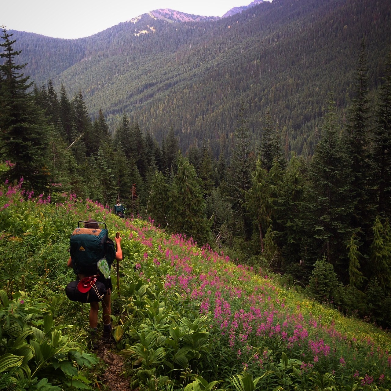 Leaving McMillan Park we made our way down into a valley, and found Nickol Creek dry. Climbing 1000’, we found ourselves at Devil’s Park. Biting flies were a bother, so we quickly moved on after enjoying the views of widespread green pastures and wildflowers. 900’ later we found ourselves atop Jackita Ridge. Views were jaw-dropping. We ate lunch at the top of the scree field and then made our way down its 1000’ descent. We soon found ourselves climbing another ridge and in need of water. At the next loss in elevation, we found a fiercely rushing creek at bottom of the basin. We rested in the wildflowers and snacked. Bugs were few. We made a third climb after this where we came to a ridge with views of Devils Creek and Anacortes Crossing. The trail was brutally steep and annoyingly brushy as we made another long descent. Using cairns, we found our way across the creek at the bottom of the basin and up another 700’ before finding a solid camp near a water source where we filled up.