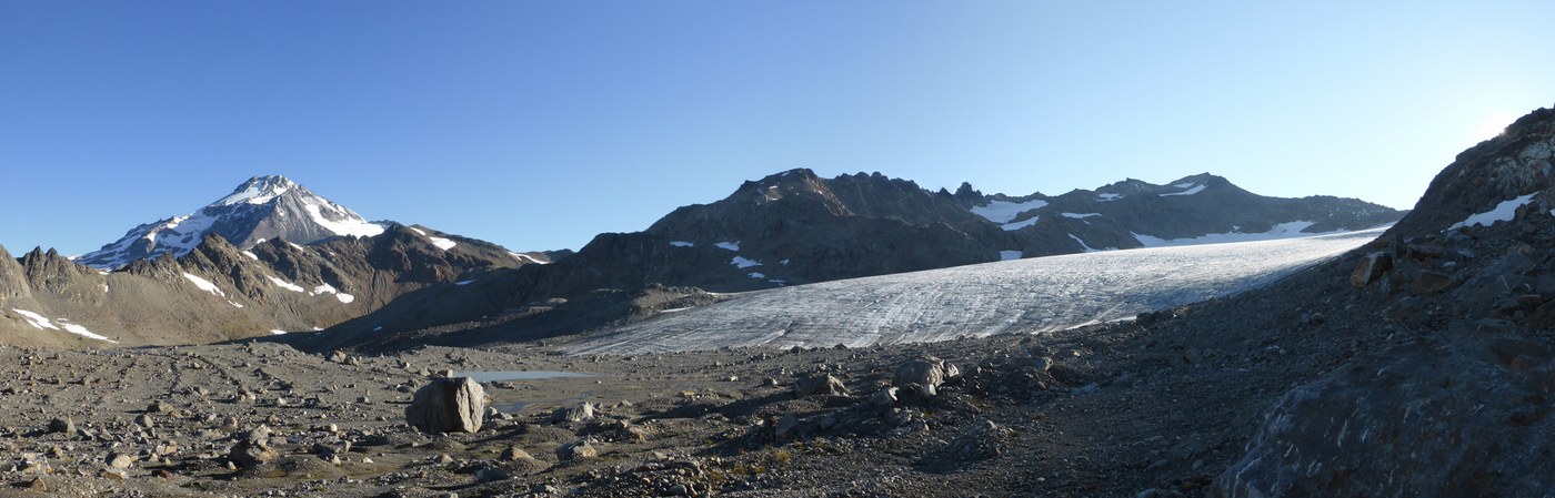 The second day we left our tent behind and did a small loop in the White Chuck Glacier basin, originally intending a fairly big loop to Glacier Gap and the big tarns at 6433 feet. This turned out to be a bit too ambitious because of the long previous day, and we wanted to spend the second night a bit closer to White Pass to make the 3rd day out easier. The day hike in the basin was still absolutely stunning though. We first hiked by the bottom of the White Chuck Glacier, which I can highly recommend, in particular in the morning sun. We walked in the direction of Glacier Gap, eventually turning around and descending to the big muddy lake. After returning to our camp site we packed up and hiked until the end of the Foam Creek trail for the night.