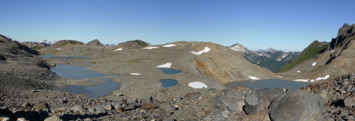 SW of Glacier Peak there is a large basin that used to be covered by the White Chuck Glacier. The glacier has retreated far up the mountain though, which leaves a surreal landscape of tarns, gullies, and large rocks spread out. It's a beautiful place that can be visited with a backpacking trip of 3 or more days, and despite the stunning landscape you can still find solitude here.