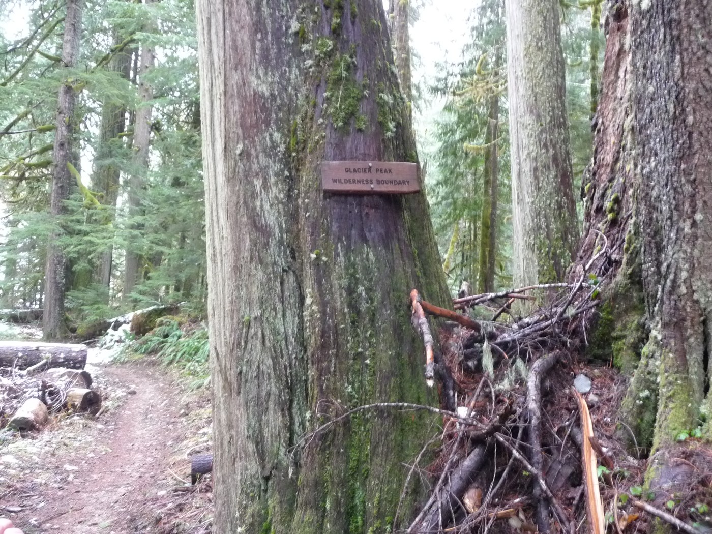 Leaving the trailhead is like entering a cathedral. One is immediately surrounded by massive cedar and fir trees causing us to once again travel at a snails pace while gazing upward instead of forward. These are some of the largest trees we have ever encountered in our travels all saved by the Glacier Peak Wilderness in 1960, four years before the Wilderness Act was passed by congress. The trail base is pretty much hard sand covered with fir needles - kinda like walking on a pillow top mattress - nice!. There are a few areas of rocky/rooty trail with minor ups and downs along the way. We only traveled to the Pilot Ridge Trail cutoff 2.7 miles in with our allotted time due to continuous stops to admire trees, solve the worlds problems and to provide update on our patrol mascot, Kate Upton. This trail intersection provides a nice lunch spot in a large campsite right on the river. You could just sit and stare at these trees all day.