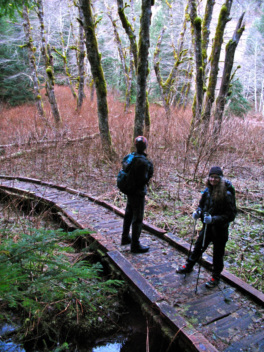 Looking back after the first creek crossing, there is a great view of snow plastered Sloan Peak. The amazingly stout log bridge at Red Creek was very icy. We began to get into a little crusty snow in the avalanche track just before the Mackinaw Shelter, but for the most part the trail was snow free.