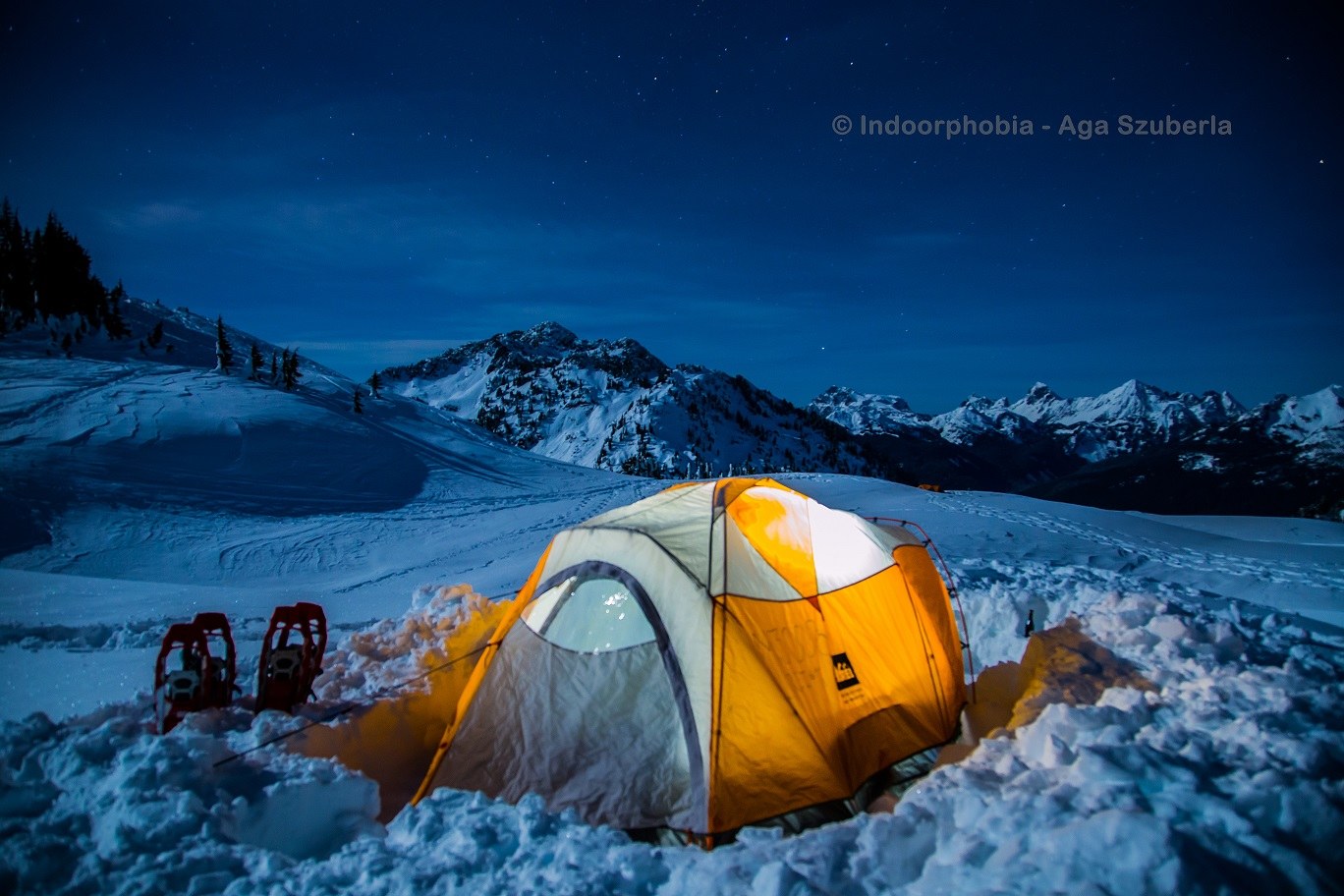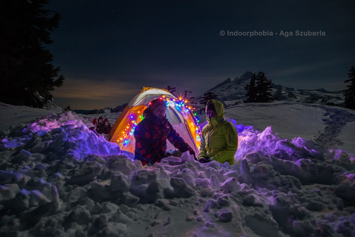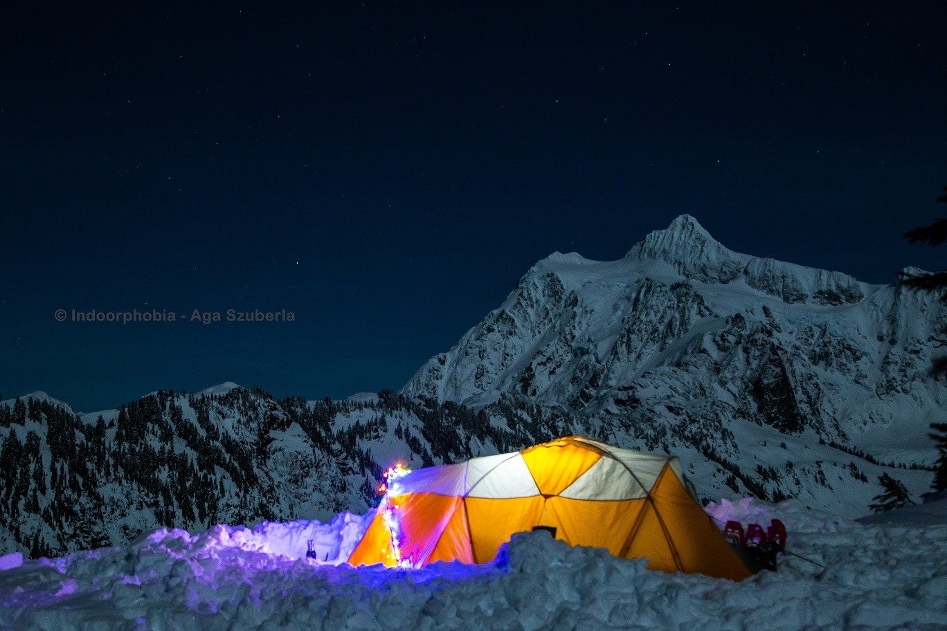We arrived at Mt. Baker Ski Resort well before sunrise so we pretty much avoided all the "craziness" that typically develops in the afternoon ;) We had plenty of time for morning hot tea and then another "tea" just before we put on snowshoes. It was a little chilly, but then sun started to warm everything up. We took a less traveled trail to take some pictures and record some videos. Snow was crispy, but conditions were great with no wind and limitless visibility. We arrived at Artist Point in early afternoon. We only spotted few backcountry skiers on our way up. We decided to find a good camping spot and set everything up earlier to have more time for enjoying beautiful views and take some more pictures. It was very hard to decide on the best spot as there were few good options. We didn't want to stay at the same place as last year. We wanted a little different view this time, but still unique. Once we set up our camp we noticed couple other parties with tents. It was busier than last year, but there was plenty of snow to share ;) As we watched amazing sunset on both Shuksan and Baker we knew it would be a long, cold night, but at the same time we couldn't think of a better place to welcome a New Year. Moon was bright and it was calm. We took some pictures, finished our meal and then patiently waited for midnight (it was only 5 PM). After playing some games and few laughs it was time for some sparkling wine and night photography. It was finally midnight. While most people were celebrating New Year in their warm homes or at all sorts of parties we raised our mini bottles and starred at the mountains in the moonlight. It's hard to describe a moment like that. It's just perfect. Although moon was way too bright we managed to take some nice photos that will always remind us of that special night.