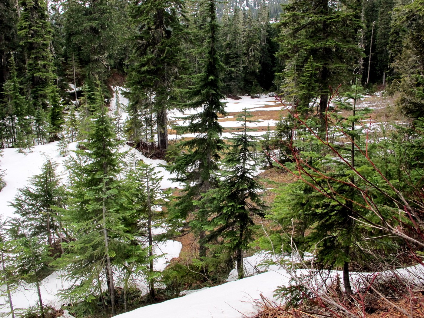 A little more than a year ago, I had to snowshoe two miles just to get to the trailhead.  Today, I drove all the way to the trailhead without seeing any snow, and saw none on the trail for the first mile.  The next mile until the meadow was increasingly sloppy-mud, snow, and water.  After slogging through the meadow, I attempted to find the "climber's trail" mentioned in 100 Hikes In the North Cascades, but had no luck.  I did find one flag tied to a tree, in the middle of a very steep bushwhack, but couldn't find any path nearby.  I continued up until I hit my turn-around time.  Looking at Google Earth and reading older trip reports, I should have stuck closer to the waterfall before attempting to gain the ridge.  It would probably be a good idea to come here in the summer when I can actually see the trail.