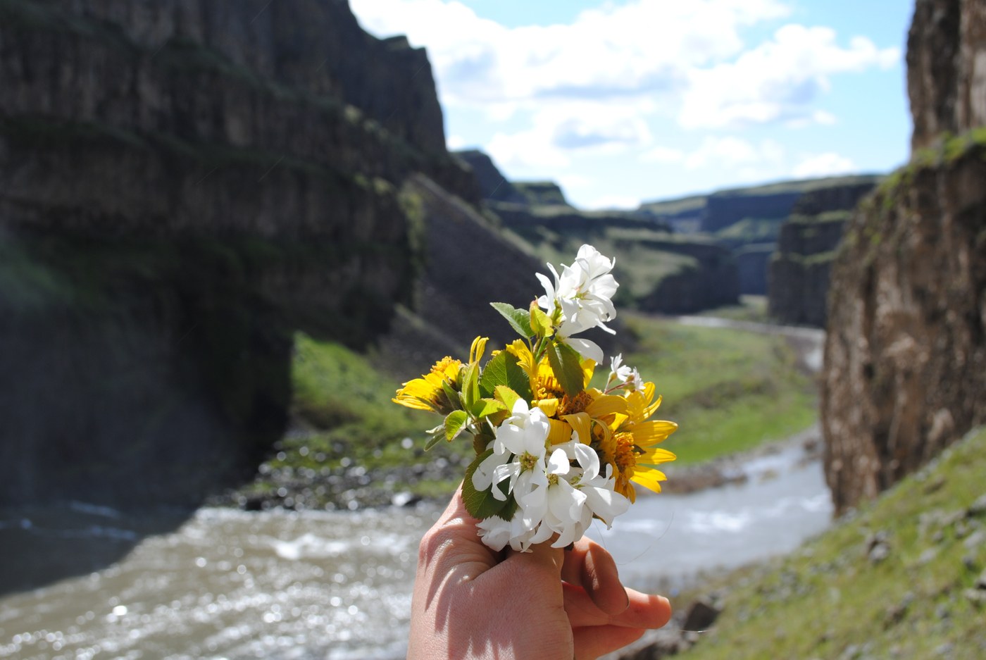 What a neat sight, something you would never expect driving through the Starbuck-Spangle area, you feel as if you are in the middle of nowhere (as you are) and then boom, this. I think it's sort of dramatic to call it a hike, as it's a super short trail in good enough condition to be paved, something you could take grandma on. I didn't know what to expect and came over-prepared, but got to enjoy a lunch on a cliff over a waterfall aswell as a little bouldering and aimless wandering around. I'm happy my eyes got to see this, pick the yellow and white and purple wildflowers, and soak in the cold mist of the waterfall. There is not really a trail to the beach, and I don't think most people that come here go to it, but the dirt slope to get down to it was actually extremely difficult for all of my able-bodied friends and I. You just have to accept that you're going to slide and ride it down, really. There's a few stable rocks as stairs, and then alot of loose ones that can fly down below you if you're not careful. Also a little tricky getting back up:) yet, so worth it. Great views on top and below the fall.