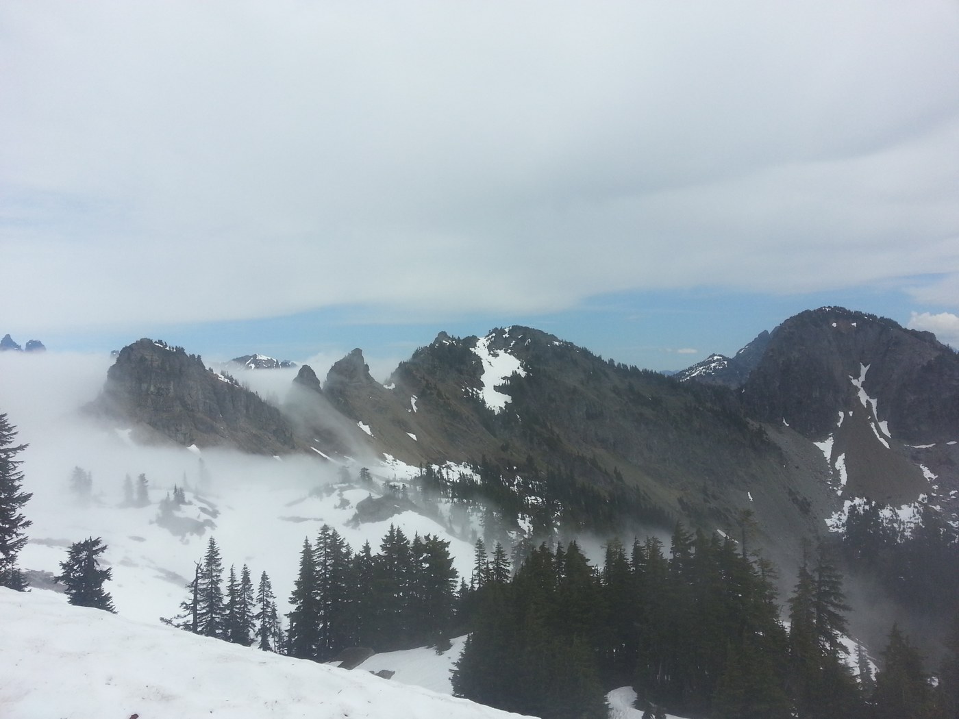 After Rachel Lake, on the way to Alta Mountain (or Lila Lake if you wish to go there), you'll find quite a bit of snow. There is snow on the way around the right side of Rachel Lake. It may be hard to find if you are the first one to go that way, but it's melting fast and I expect the path will be clear very soon. As it gains elevation up to the ridge, the snow cleared and we were back on an obvious dirt path. Then we hit snow again as it neared the ridge, and the ridge was completely snow covered but not deep. If you get to the ridge, the trail to Alta is initially hard to find. For example, if you find the sigpost, you'll see that most people just headed straight across a wide opening in the trees, but that drops off the other side of the ridge. You need to just step backward from the signpost about 15-20', and look to your right. You should see a bit of a path that goes near the rocks on the right side of the ridge as you head toward Alta. Just stay on the ridge crest or just left of it and you'll find clear path soon enough. It has a few more spots of snow to cross.