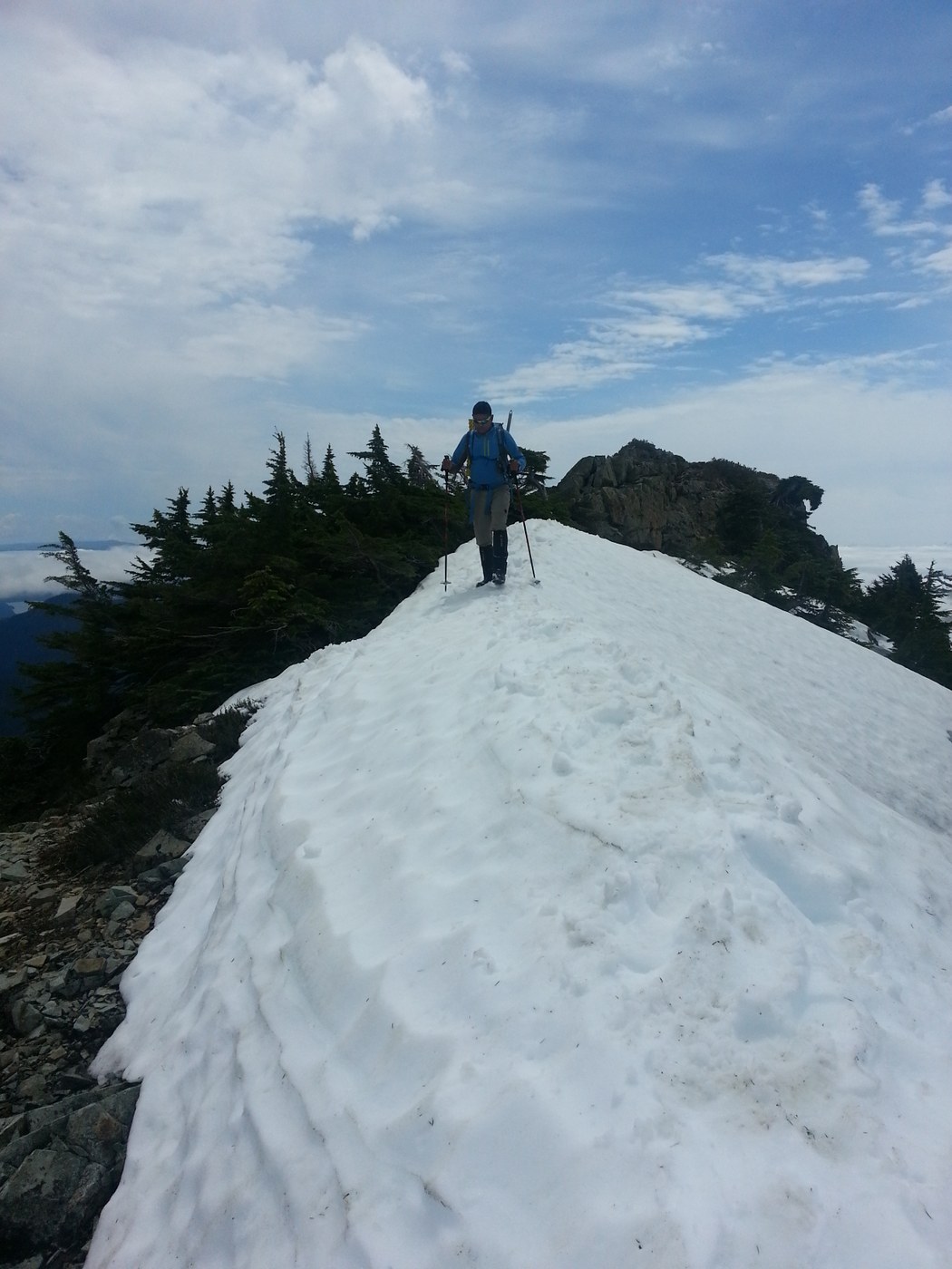The day was foggy below 5500', but we were out in the sun or only light fog as we climbed the ridge! If it hadn't been clear enough, we probably would have headed back. At the summit, we saw three guys who had day-hiked from the lake. We had lunch and headed down. We followed the ridge all the way down and found the small cairn on the Lila Lake trail junction that we had missed earlier. It was covered with a little snow. We cleared it off, but it's a very small cairn just to the left of the trail and not very obvious.