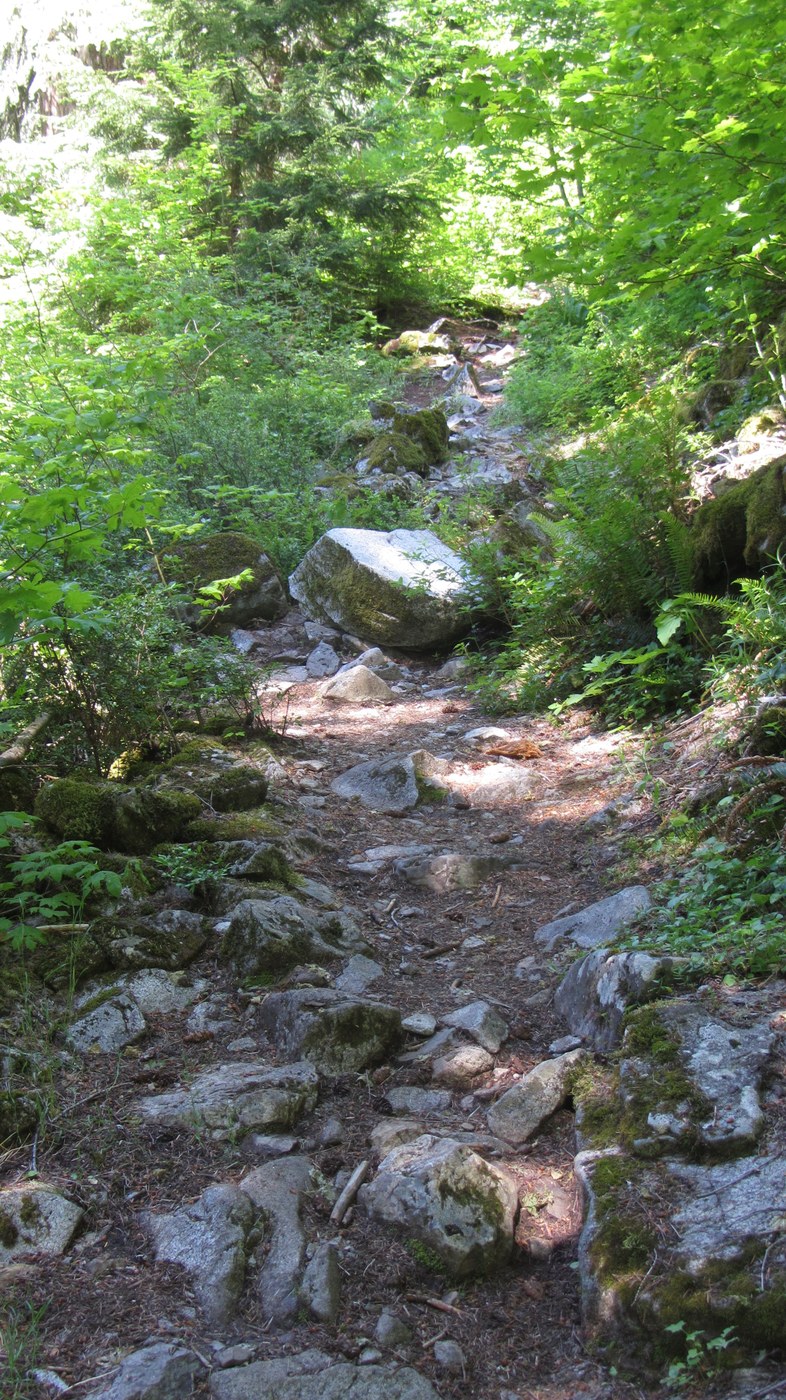 Left trailhead at 8:30am trying to beat the heat. About a mile in we saw a nice healthy black bear or rather his/her butt as it disappeared up the rocks. Trail is pleasant with a few huge old growth firs on the way to Trout Lake then the trail started the climb. Over 2000 ft in less than 2 miles with a lot of brush. With the heat and heavy damp brush it was like trying to do a stair-master in a sauna. You can see the falls which is the out flow of Cooper Lake from many of the switch backs. For those of us with shorter legs the endless steps up were a challenge. At the top of the brushy area there is a nice little stream to cool off in before you enter the woods for about a 1/2 mile. Wonderful carefully placed rocks lead across the outflow to a great view of Copper Lake. We had lunch and cooled off, then went up to Little Heart Lake. With 80 degrees decided it was time to turn around and head back. Met many overnighters with large packs headed up. Beautiful lakes and nice see the alpine area. Very low snow. Estimate patchy snow on peaks across Copper Lake about 5000+ foot level.