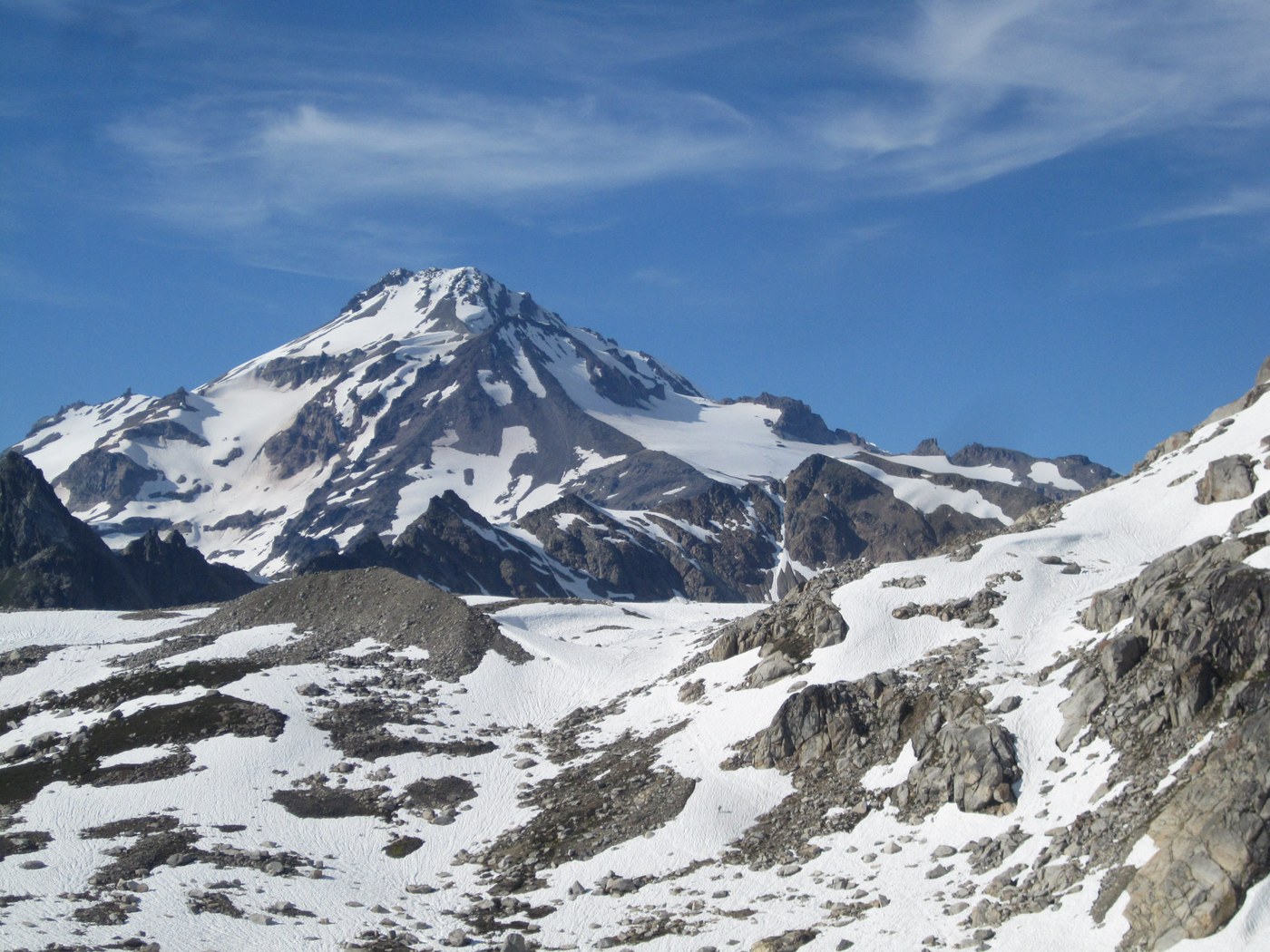 The route to the White Chuck follows the PCT toward White Pass for about half a mile, and turns easterly onto Foam Creek Trail for 1.5 miles. I noticed that Foam Creek Trail is marked on newer Green Trails maps, but not the older ones. The Foam Creek traversed beautiful alpine meadows, full of heather, flowers, and an occassional marmot. We crossed very short chunks of snow in each little stream drainage, but not much. At the end of the Foam Creek trail, we could see Glacier Peak just over another col. The official trail ends there, but a climbers path drops down to the headwaters of Foam Creek and then up to that other col you can see. From there, the view opens up even more, down into a large glacial meadow basin dotted with snow and running water, mostly snow this time. We went down into that basin to camp and begin our climb the next day. In that basin, there were a few marmots too. We buried food in the snow, but a bear canister would have been good. There were no mosquitoes that high (6400').