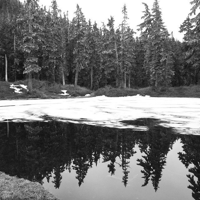 Passing the lakes (ponds) was fine, but within a few minutes we started encountering snow on the trail... and more snow, and more snow... we probably should have turned around when we ran into some skiers, but we just followed them for a while, thinking we might be close. After crossing many snow fields and almost losing the trail a couple of times, we realized that it was time to turn back. The skiers were still ahead of us, but the "trail" started getting really difficult and it looked as though they were about to turn back too.