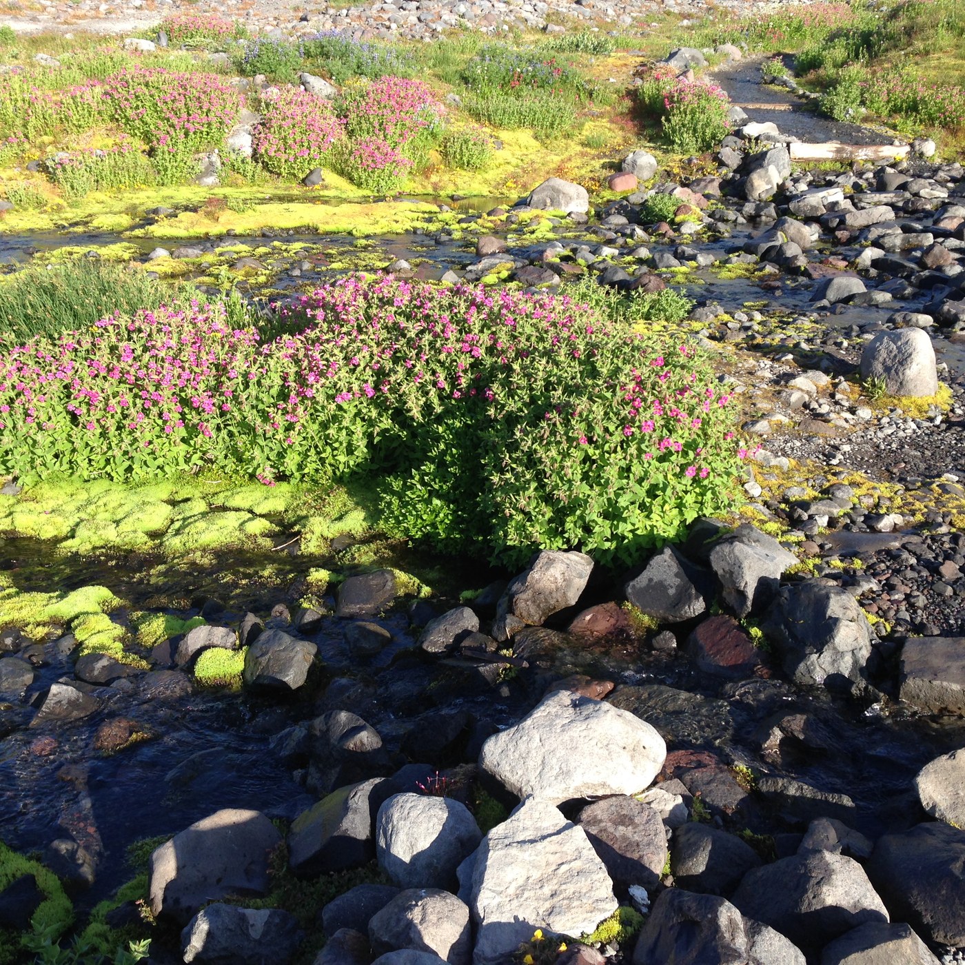 The Lakes trail up Mazama Ridge is in great shape, with many views and fields of wildflowers along the way. A big bonus was an unafraid male blue grouse by the trail, displaying a large, yellow throat patch, in addition to a tail fan. Frequently heard, but seldom seen. Turn right at the junction with the Skyline trail, admiring the views of the Muir snowfield and Paradise Glacier above. Soon I was crossing a magnificent rock garden of wildflowers amid rivulets of cold water from the melting snows. The views south got better and better, from the Goat Rocks to Adams to St Helens, rising behind the ever more scenic Tatoosh Range. So clear that I could see not just Mt Hood but even a little of Mt Jefferson way down in the heart of Oregon.