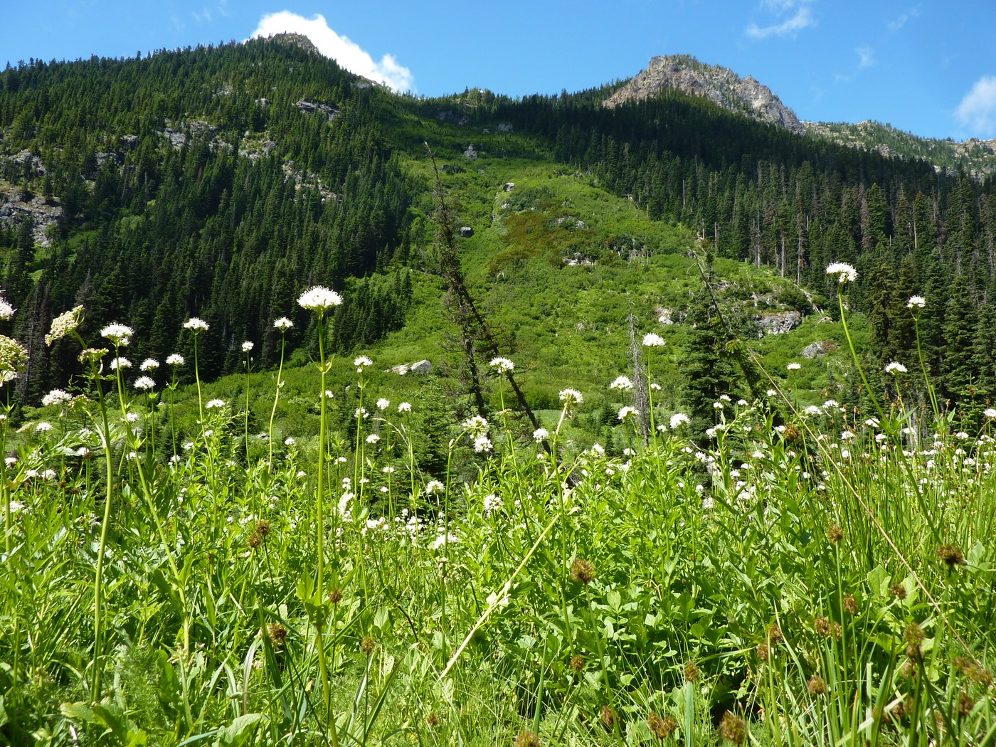 We arrived at the trailhead at 9:45am, and started up the Phelps Creek trail. This trail was once a road, and is very easy hiking. The flowers were in their prime, and we actually passed the junction with the Leroy Creek trail and just kept hiking up toward Spider Meadows. I later realized that we'd hiked more than the three miles the to the junction, and we went back and headed up the Leroy Creek trail (the junction is very well marked).