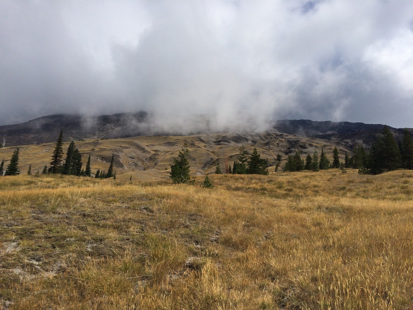 The rain let up after awhile and the sun broke through the clouds for just a few minutes over the plains. We went up to windy pass before going down and back up several canyons. There was water in 3-4 of these but was mostly very muddy. If it wasn't raining there may not have been water running. We made it back to June Lake Trailhead at 3 pm. We hiked 16-17 miles that day.