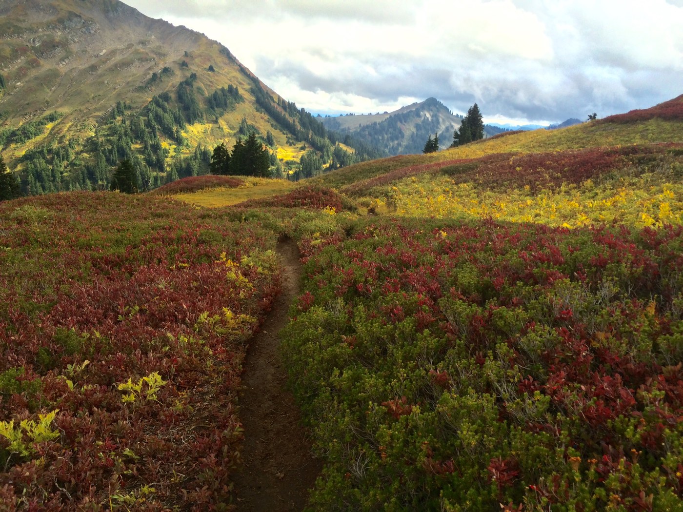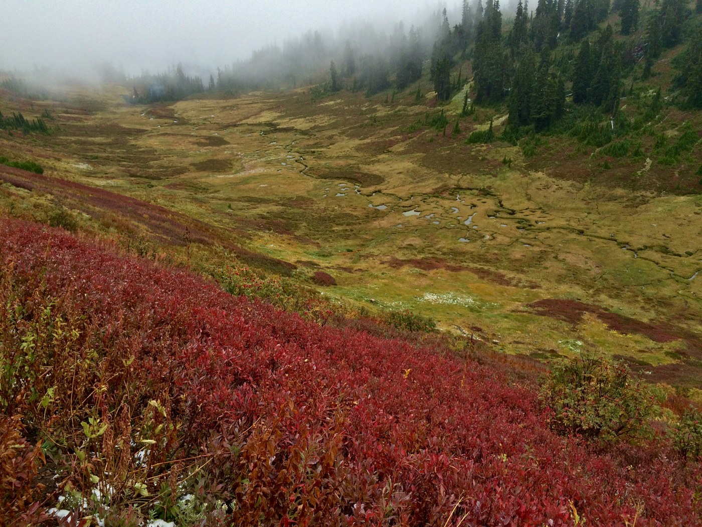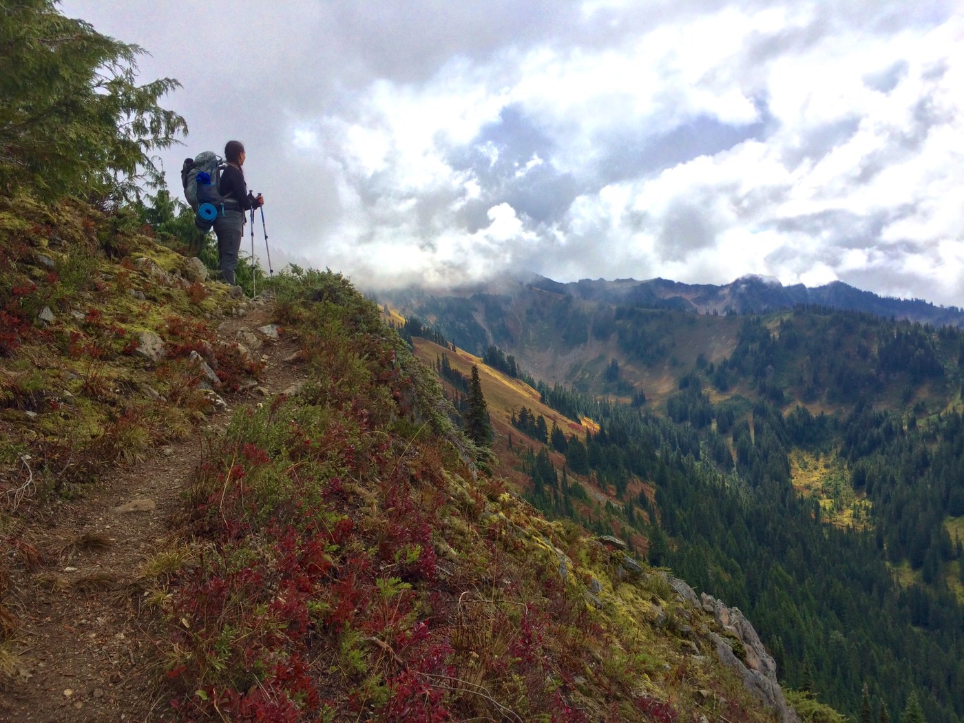We made it to White Pass about 3hrs later after leaving Mackinaw and quickly layered up and sat down with the map. Glacier Peak was completely hidden except for one of the lowest glaciers. We met a lot of folks turning back attempting their climb. Given the wind and the cold (and the looming scary clouds) we decided to push on to Indian Pass so we could camp 1000ft lower down. On the way we got caught in a hail storm but it didn't last too long. Fall colors are out in abundance!