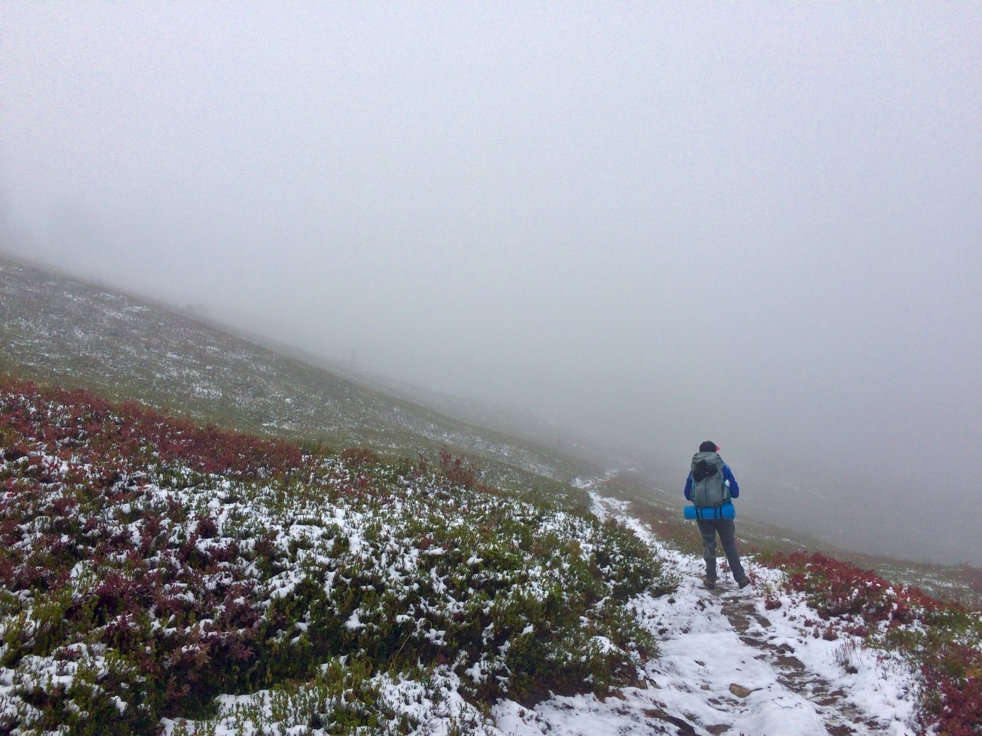 We got to Indian Pass around 5:30pm and set up camp - there is plenty of water here right now. We woke up to about an inch of snow outside the tent in the morning but it was melting quickly. Looking up at the ridge we were glad to have made the push to Indian Pass - lots of snow up there! After sleeping in and packing up we hit the trail at 11:30am. Soon ran into a Forest Service ranger taking down all the wildlife closure signs, which was great to hear that things are getting contained now! Climbing back up higher we entered a snowy and foggy world, but it was great to finally see so much moisture all around after this very dry summer.
