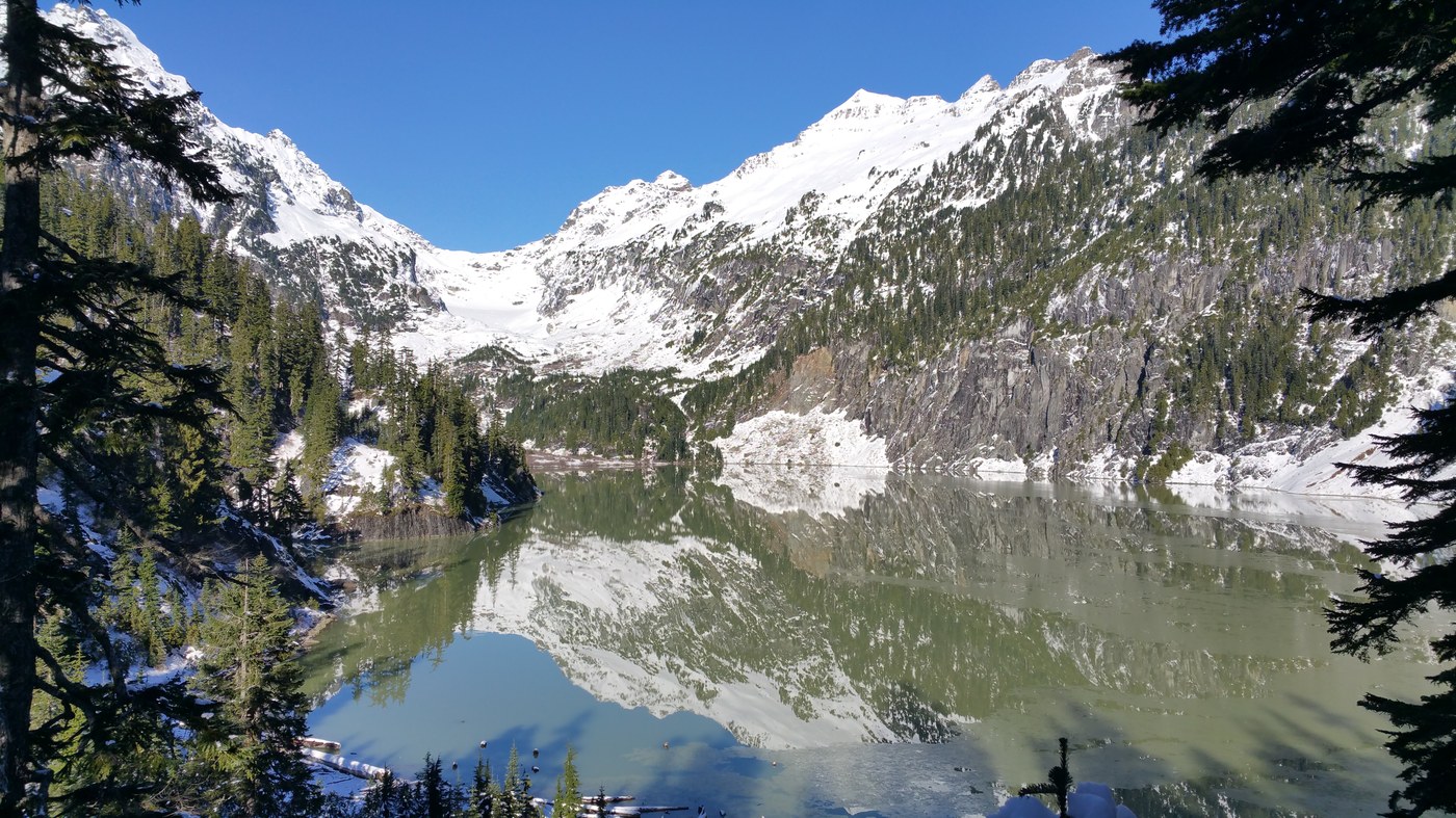 As the previous report stated, the trail is in good condition all things considered. Once we got to the top we decided to put on our snowshoes as there was about 12 inches of snow at times (much higher where it accumulated). I think spikes would have been plenty to make it too the lake though. On our way out we passed at least a couple of people with snow shoes and a couple groups with just boots. Until it snows again the snow is relatively well packed down on the trail and it is easy to follow.