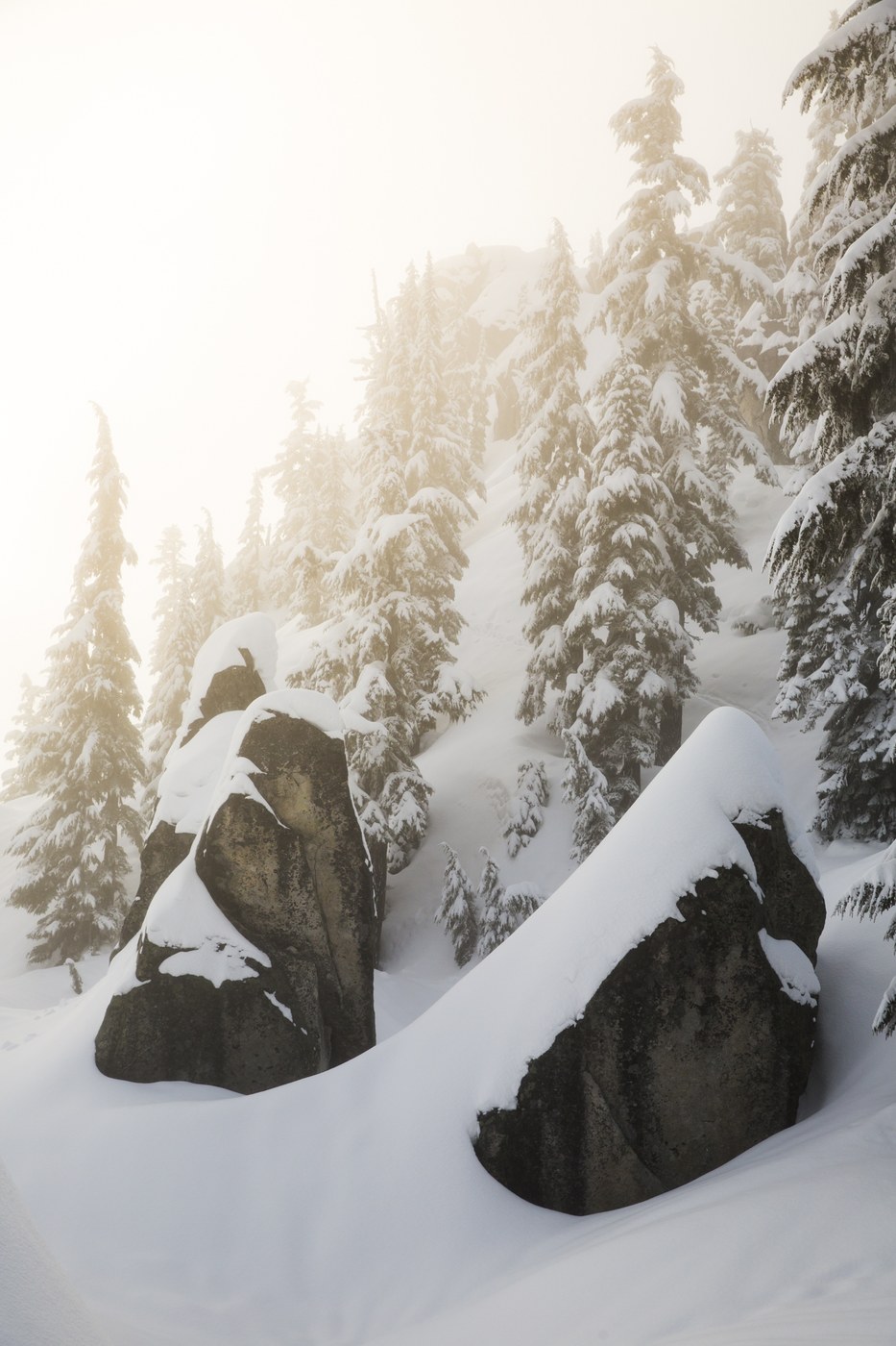 This is one great hike! It can definitely be a bit strenuous as it's almost entirely uphill. The good news is that it's a very wide and easy to follow path that starts right at the power lines in the north Steven's Pass parking lot. There's a point near the top where you step off the wide path, it's not at all easy to find. At least it wasn't when I was up there, and it looked like there were a few inches of fresh snow. Luckily my cell phone had perfect service and Google Maps actually shows the trail. Unfortunately the path on the map only brings you to the Skyline Lake, it doesn't bring you to the cool boulders or the peak. So I bushwhacked a bit and managed to get there just fine. Although when I tried to reach the real peak, I quickly realized that it would be a bit dangerous. It was very steep, and my snowshoes couldn't stick. After a few attempts I decided to call it quits and head back down.