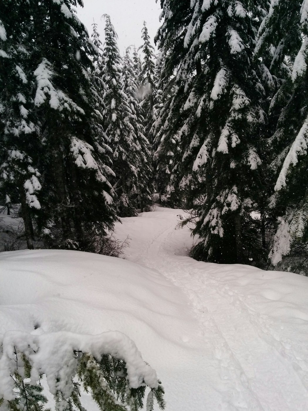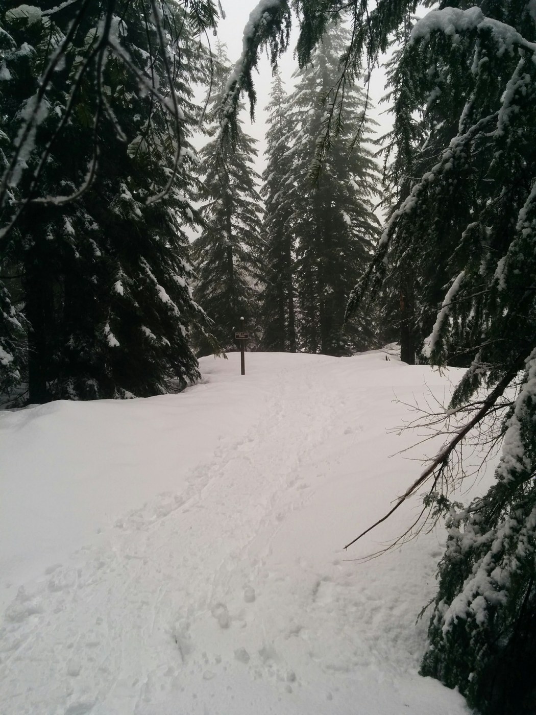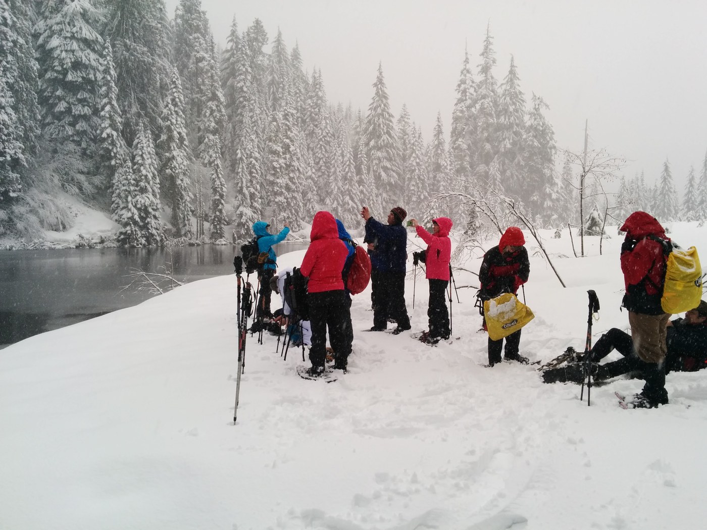 Guided trip with husband and wife team Bob and Katherine Appling, both naturalists with the Mount Saint Helens Institute. Met at Marble Mountain Sno-Park and proceeded along the snow covered road to the June Lake Trailhead, we could just walk with boots on the road until we got to the trailhead at which point we donned our snowshoes. Snow was falling at this point but not too heavily, trail was clear and we must have been the first group of the day judging by the lack of prior tracks.