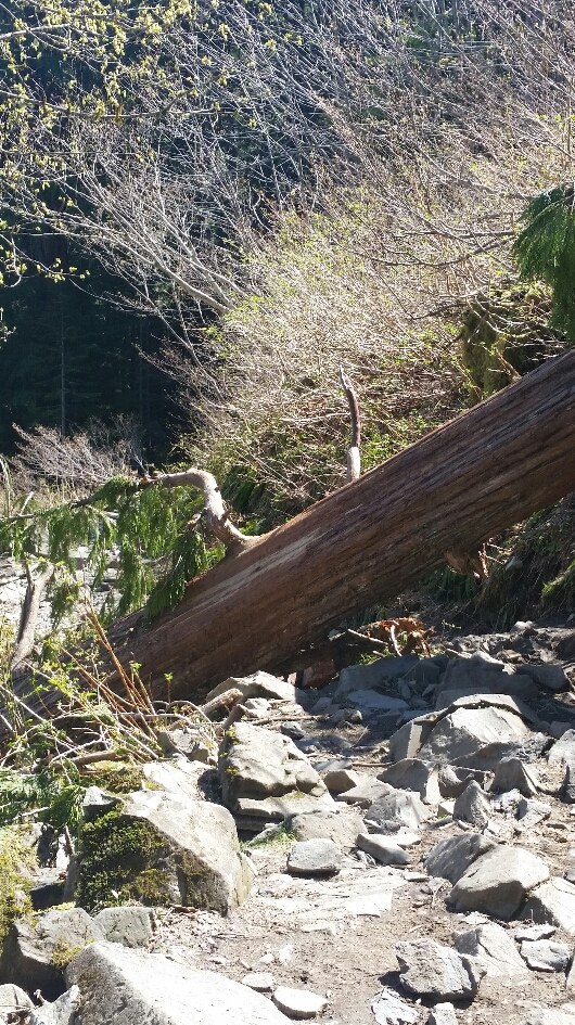 We started early in the parking lot was already filling up. Easy two and a half miles up took us about an hour and a half. Two minor obstacles trees over the trail we had to climb under and a little snow at the top that was easily maneuvered. Great early spring hike.
