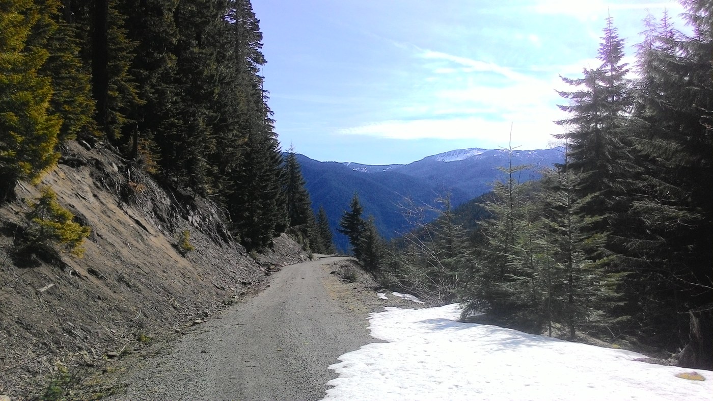 Suntop trail was going to be the first part of my Saturday’s mountain bike course. I’ve never ridden this trail before and I was hoping that it would be snow free. So I parked at Buck Creek Campground and started to climb NF-7160 road. In a 20 minutes I had to start jumping over the fallen trees and I was finally stopped by the snow on 3600 feets (highest point of my course should be at 4300 feet). I decided to turn back and try to make a “Ranger Creek to Palisades” loop but it is the completely another story.