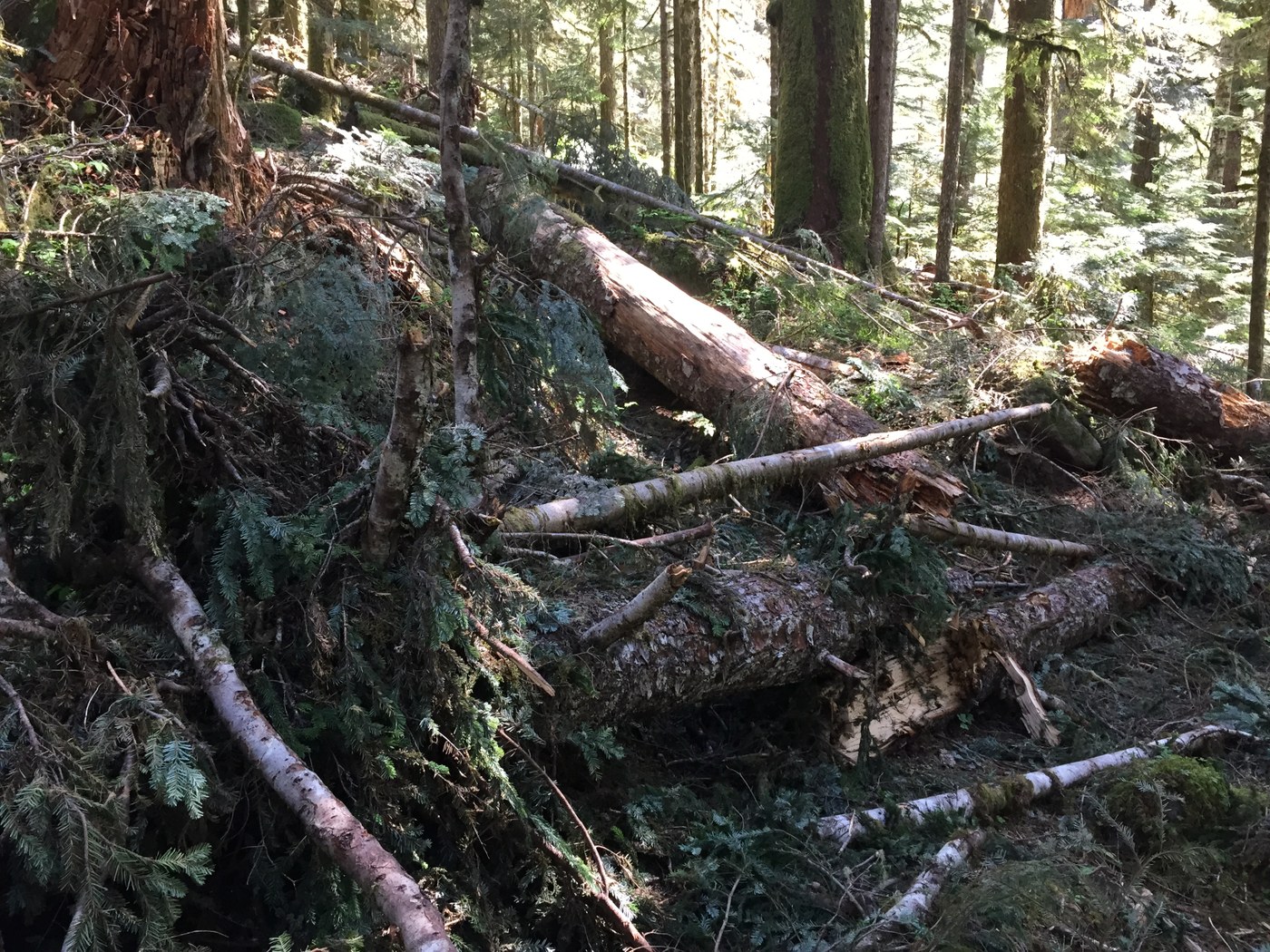 The trail gets much less use after the falls and lots of salmonberry growing in tight gives the arms and legs lots of scratches. The trees across the trail started getting worse around mile 4. I counted 56 significant tree obstructions that I had to carry my bike over/around/through before getting to the Snoqualmie Nordom trail junction. Trail is often rough stream bed with lots of rocks making for some challenging pedaling.
