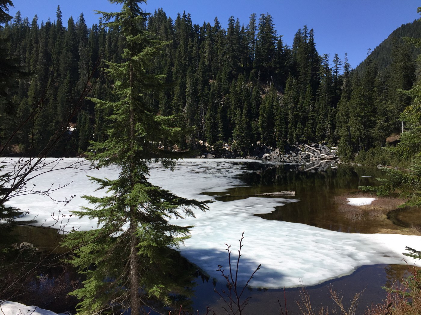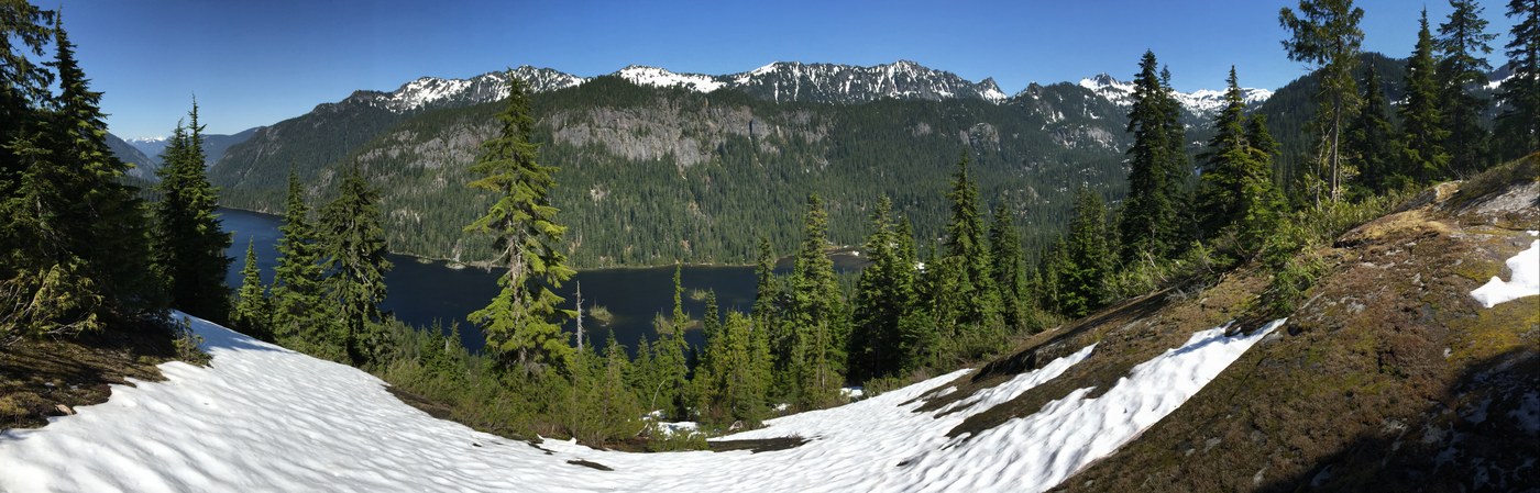 Starting the Snoqualmie lake hike I immediately was hit with many more large tree obstructions in the trail. I counted 35 more blocking trees in the first mile or so of climbing. This made the 2 miles to the lake go much slower than normal. Snow patches start just at the lake and rapidly cover most of the trail as soon as you round the shore to climb to the next lakes. Lake is 90% snow covered. I saw two decent campsites that were clear and both were occupied.