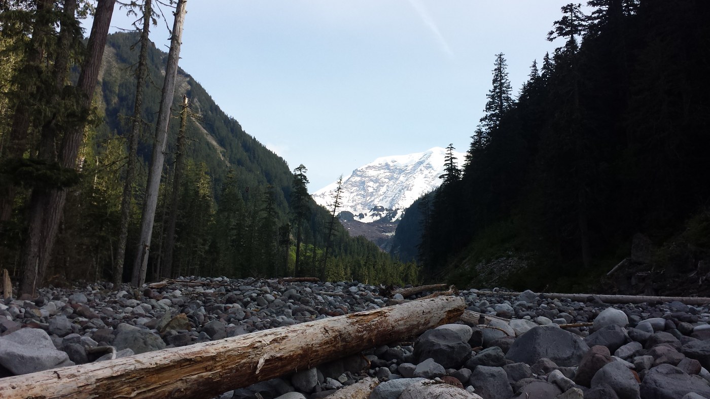 Further on, there is another section of trail washed out, which forces all hikers to take a detour across the carbon river. The river bottom is very wide; there's a sign at the trailhead advising hikers not to cross the river because of fast moving waters and flooding dangers, but it was the only option for me and so I did anyways. Saw a group of hikers crossing from the other direction, they gave me a few tips on crossing. There are two streams that you will need to cross. The "bridges" are simply fallen logs, and the path leading to each one is marked with cairns (although I found it somewhat difficult to follow them). The crossings are totally doable, although I wouldn't take your kids across them; they are not the safest logs to be walking across. Adults should be fine.