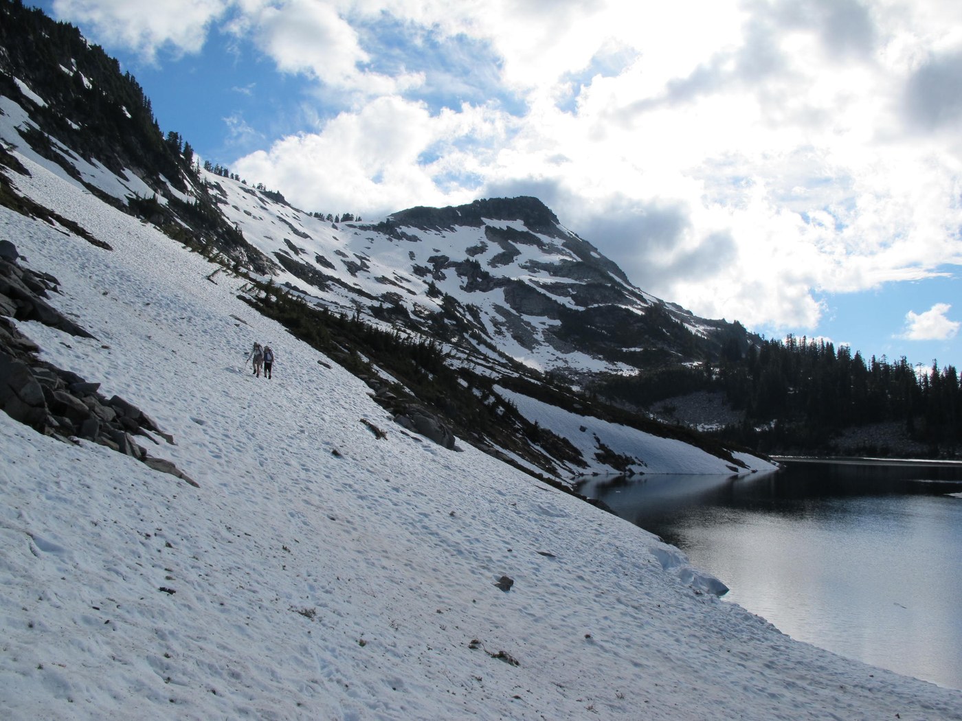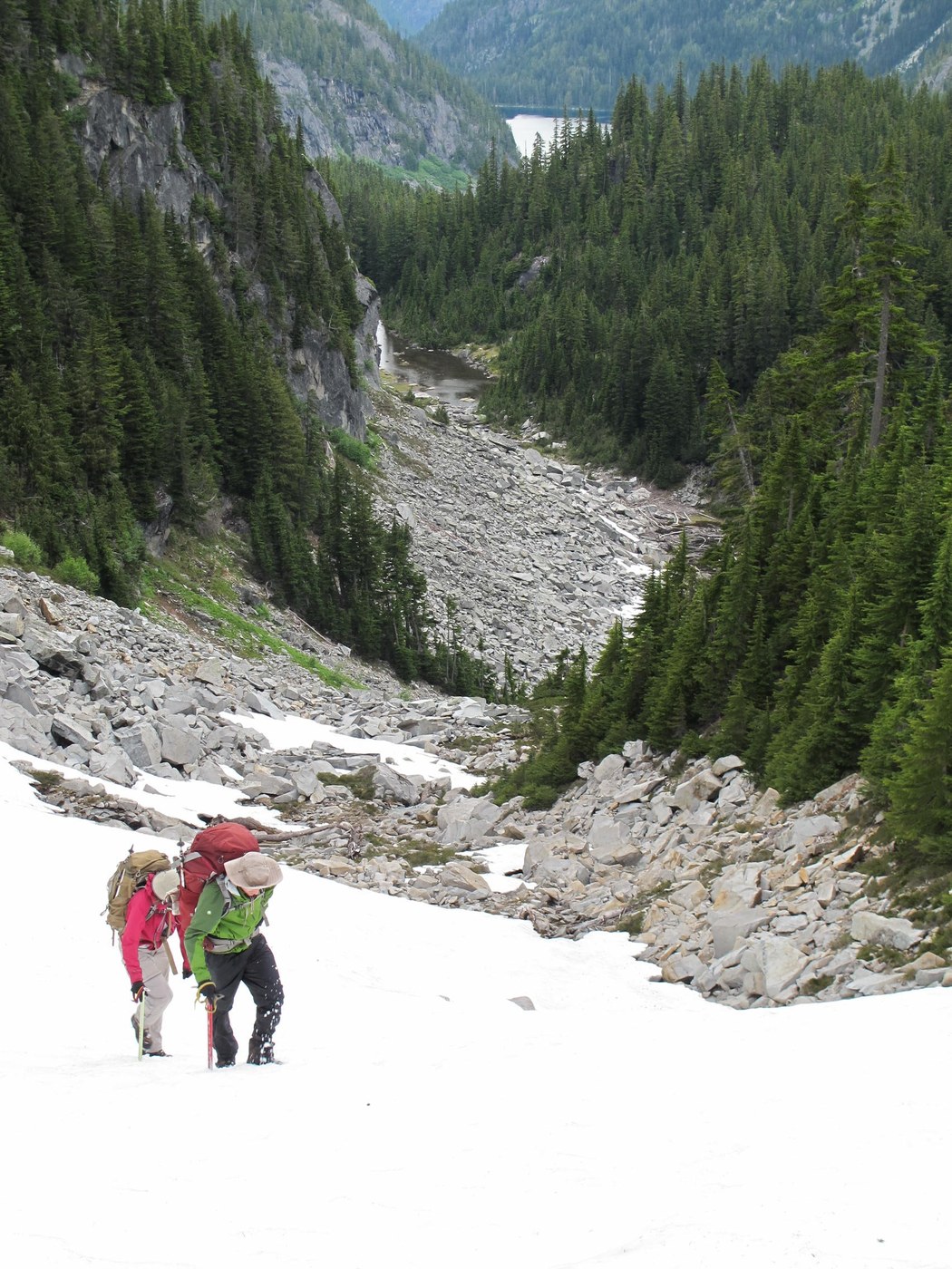 Day 3 we followed the alpine lakes high route description to Azure Lake (easy to follow track), then Azurite Lake (not so easy). We finally found a track down to Azurite just a little way S of the cliffs at the W side of the lake (SW corner of lake). The ledge at the SE part of the lake was easy to negotiate - we did not have to use the handline I brought. We also could not find the track from Azurite so decided to head generally SE (gnarly bushwhacking)until we reached S of Otter lake (this was after passing through a swampy area not shown on the map and climbing a couple hundred feet. Glory be we spotted a cairn above us on the rock slide and we able to pick up the track again! This brought us to the 2 small lakes S of Iron Cap pass and easy step kicking up the snow to the pass. Camped just on the S side of the pass that night.