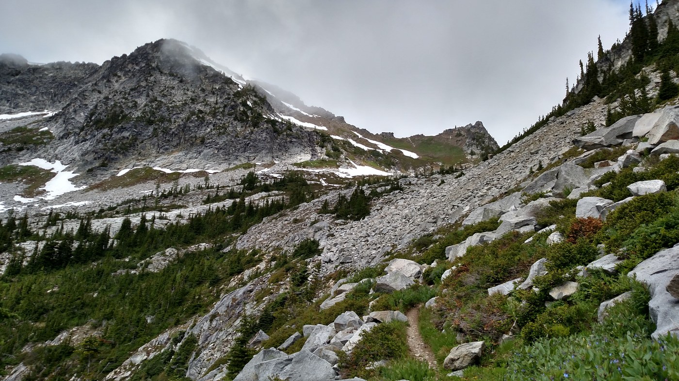 Once you drop down the north side of Icicle Ridge, there are still several significant patches of snow covering the trail. I used microspikes, but the snow was soft enough that I’m not sure the spikes actually made a difference – I just would’ve felt really stupid if I’d slipped on the slope with spikes in my pack instead of on my feet. I was glad for my trekking poles. Didn’t bring an ice ax, and didn’t miss it.