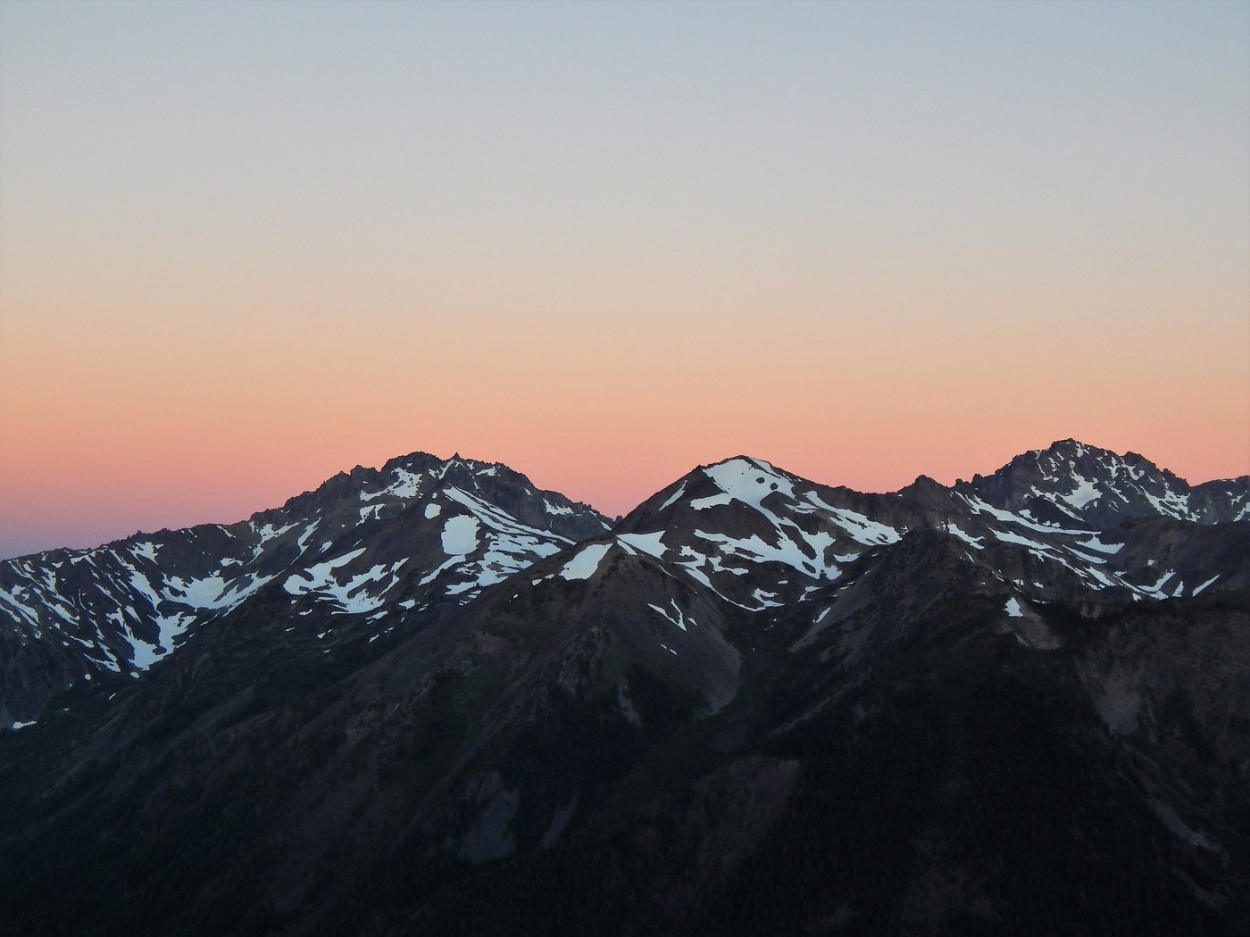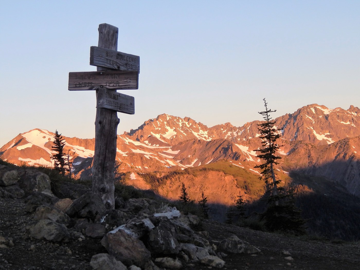 The next morning I got up to try to get some sunrise pictures. Complete opposite of the day before---not a cloud in the sky. If you really want to see the actual sun coming up at this time of year, I would recommend going back up Buckhorn. From Marmot Pass I turned left this time to explore. Again there is a boot path that runs along the ridgeline. There were some patches of snow but nothing to worry about as they were not blocking the trail.