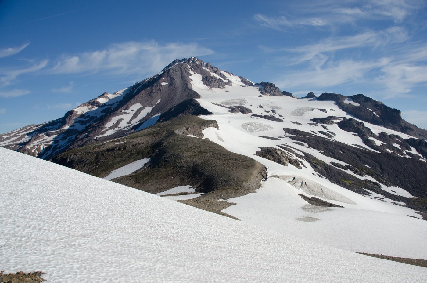 The descent from the ridge was relatively gentle and clearly marked, crossing several snowfields with substantial moats around large boulders, so watch carefully for thinning snow bridges. Soon the route begins ascending again toward the White Chuck Basin, where you enter the stark moonscape left by the rapid retreat of the White Chuck Glacier over the past century. Most climbing itineraries have you camp here, and it's certainly an impressive place, but we still had the time and energy to press on toward Glacier Gap and were glad we did. The basin is large and the trail braids out into a number of different cairn-marked paths, so it's easy to get off-course without realizing it, although all routes generally lead in the same direction. The main trail, such as it is, crosses the very snout of the glacier itself, which is obviously icy and demands careful footing despite its gentle slope, before traversing a few borderline-unsafely-steep snowfields. We almost broke out our ice axes and crampons and probably should have, since the snow ran out into nasty boulder fields.
