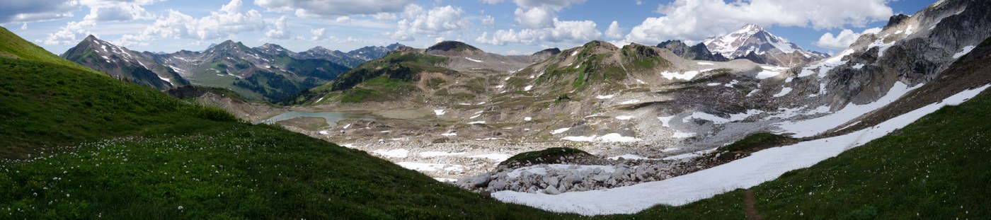 Next, you'll climb up to a hanging valley just below Glacier Gap, which requires getting up a steep ridge on the far side of the White Chuck Glacier. On the ascent, we found ourselves too low and off the main trail, so we made a very steep direct ascent up a small watercourse before hitting the route near the top. The trail climbs the ridge in a series of loose rocky switchbacks reminiscent of Aasgard Pass, although much shorter. There are some campsites around a small lake in the hanging valley, but it was still mostly snow- and ice-bound when we passed through and would be a cold place to spend the night thanks to the large snowfield right above it. We continued a short distance to the saddle just below Glacier Gap, where there are several tent spots with dry-stone windbreaks and streams just downhill for pumping water. It was reliably windy here in the evenings until after sunset, but the incredible views more than made up for the breeze. Sloan Peak and the Monte Cristo group dominated the views to the west, and we could even see the silhouette of the Olympics more than a hundred miles away. To the east were the Suiattle Glacier, the Suiattle River valley, Buck Creek Pass (one of my favorite spots), and a host of giants on the horizon: Tenpeak Mountain, Seven Fingered Jack, Mount Fernow, Fortress Mountain, Chiwawa Mountain, and Bonanza Peak, among others.