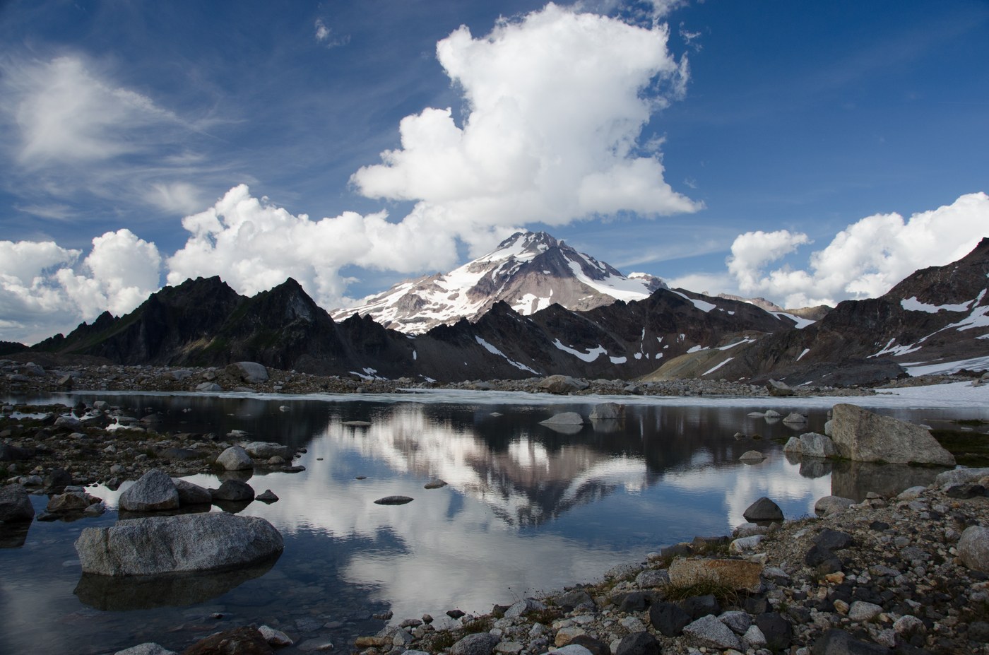 White Pass was fairly busy with PCT thru-hikers and climber groups heading up to Glacier Peak, so we pressed on to the Foam Creek Trail. It rolls up and down, occasionally steeply, while traversing the ridge, but there's plenty of water and a few small camping spots. Views of Indian Head Peak and its resident glacier across the White River valley are increasingly spectacular. About 1.5 miles from White Pass, climbers should turn left where the Foam Creek Trail ends, heading up a small stream valley to a little knoll below the main ridge. You get your first view of Glacier Peak here, and you'll want to pause for water and snacks before continuing. From here, make a short but steep drop onto the headwall of the Foam Creek drainage, briefly follow the contour of the ridge, and finally ascend to the obvious low point on the ridge via some very aggressive switchbacks that will test your mettle. (NB - some route descriptions cross the ridge earlier, closer to White Pass, but this puts you above some very steep slopes on the backside, so I would stick to the main route.) The climb is brutally steep but relatively short, and the view of Glacier Peak and the upper White Chuck valley once you gain the ridge is magical. To the left, the PCT snakes down from Red Pass past the White Chuck Cinder Cone and out of view, while directly below, a beautifully clear little lake collects water from the White Chuck Basin to the right. You could spend days exploring this valley and its meadows, but climbers have more work to do.