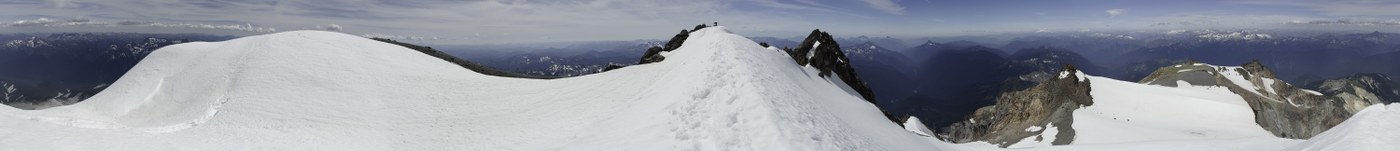 The last push up to the summit is a steep snow slope, although not as steep as the routes above the Hogsback on Mt. Hood and never enough to worry me about footing. We were able to to climb a bouldery rock ridge for a good part of the way, transitioned onto the snow, and quickly found ourselves standing beside a very nice one-tent bivy shelter just below the gentle snow ridge marking the summit of Glacier Peak. The ridge probably represents part of an old crater rim, now eroded away on the west and east with lower remnants across a deep saddle to the north. It's not clear whether the west end (housing the summit register) or the east end is higher, but it's worth checking both out for the amazing views. To the west, we caught the distant glint of sunlight on Puget Sound and Lake Washington, with Mt. Pilchuck, Three Fingers, Whitehorse, Mt. Pugh, and many others standing out. Mt. Baker to the north was partly concealed by a line of cottonball clouds, but Shuksan and the legion of other peaks making up the wild North Cascades were on full display. I was surprised that we couldn't see any of Lake Chelan to the east, but it's surrounded by high mountains that block lines of sight. Adams and St. Helens were not visible and only the top of Rainier poked above the haze layer, but its superior height was unmistakable even from this distance. Hinman, Daniel, Stuart, and the Enchantment peaks punctuated the southern skyline.
