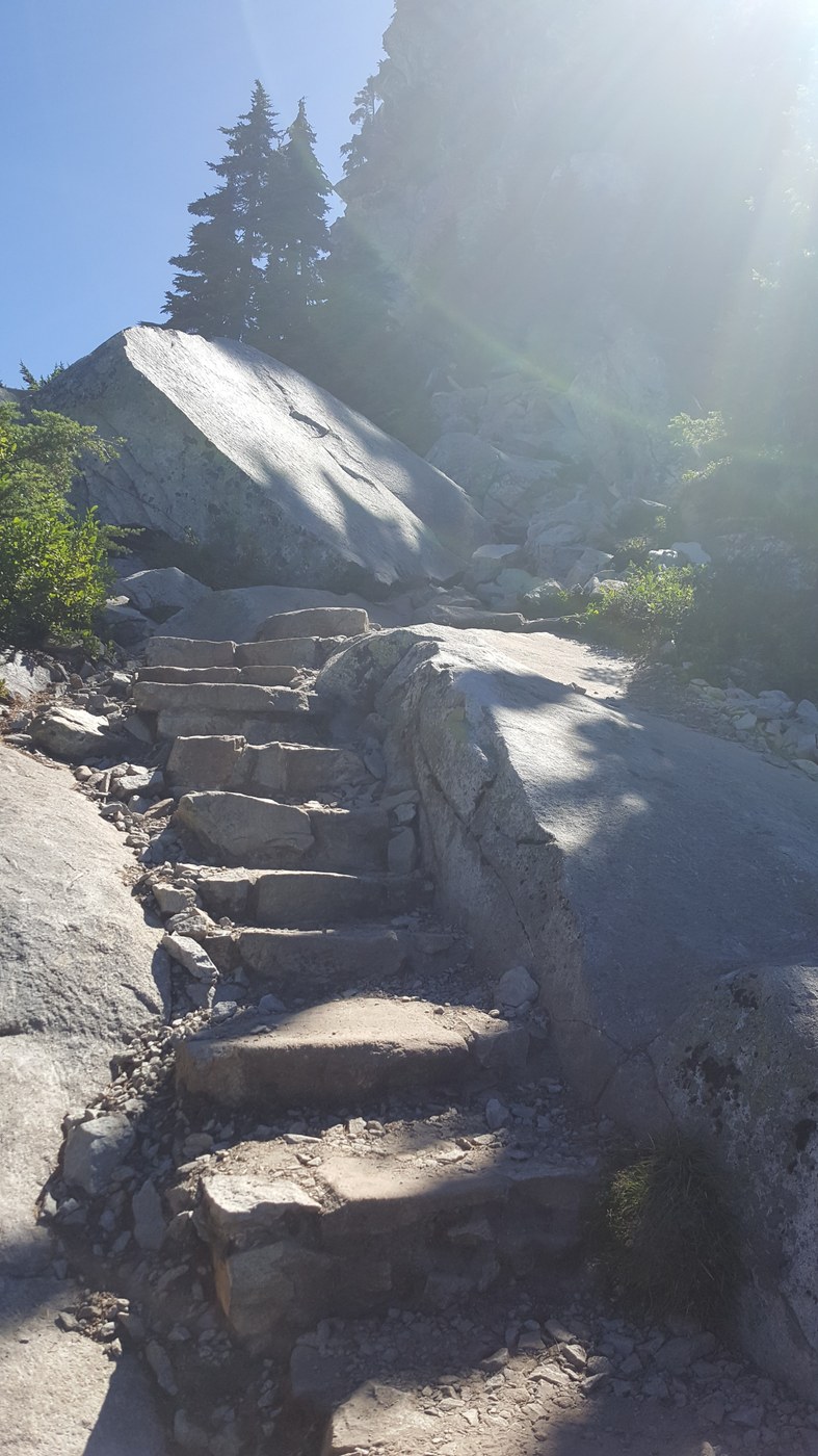 The trail; for the first mile, is in the shade, forest, with amazing peekaboo views, couldn't stop talking pictures. After about 1-1.5 miles it does get steeper and rockier, follow the trail, it's well marked with orange posts. The Boulder fields are brutal on joints both ways, so if you have any joint issues use trekking poles.