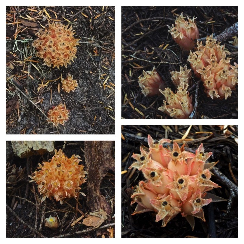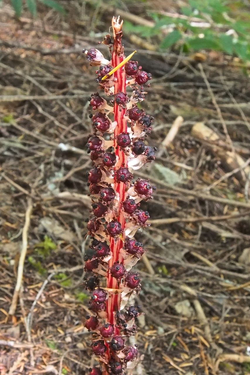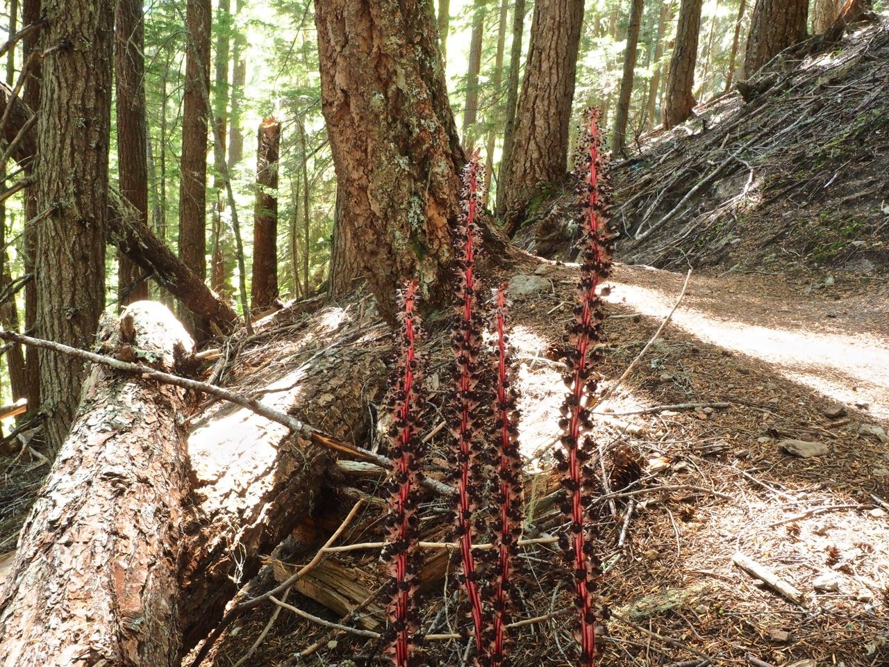 After reading MA3333's report, we decided to try to find the gnome plant seen on their loop hike. Thanks to their replies we were able to find their plant plus 12 more! We began our hike at the TH between MP 54 on HY 410 and the entrance to the Buck Creek Area. We began the hike on the White River Trail. In 0.2 mile we reached the Ranger Creek Trail. I hiked 3 miles and gained 1700 feet and Bob went 1/2 mile farther gaining 2000 feet. The elevation gain is gradual with long switchbacks. The trail was shaded which was nice on this hot day. We met 3 pair of mountain bikers coming down the trail plus two single bikers who were coming up as we were nearing the TH on our return. This is a popular mountain bike trail. We saw one trail runner, but no other hikers. We saw over 30 candy stick plants in varying stages of growth (more than we have ever seen on a trail), 12 or more gnome plants and many bog orchids past their prime. It would have been good to have been on the trail 2-3 weeks ago when the plants were at their prime. Maybe next year! :)!