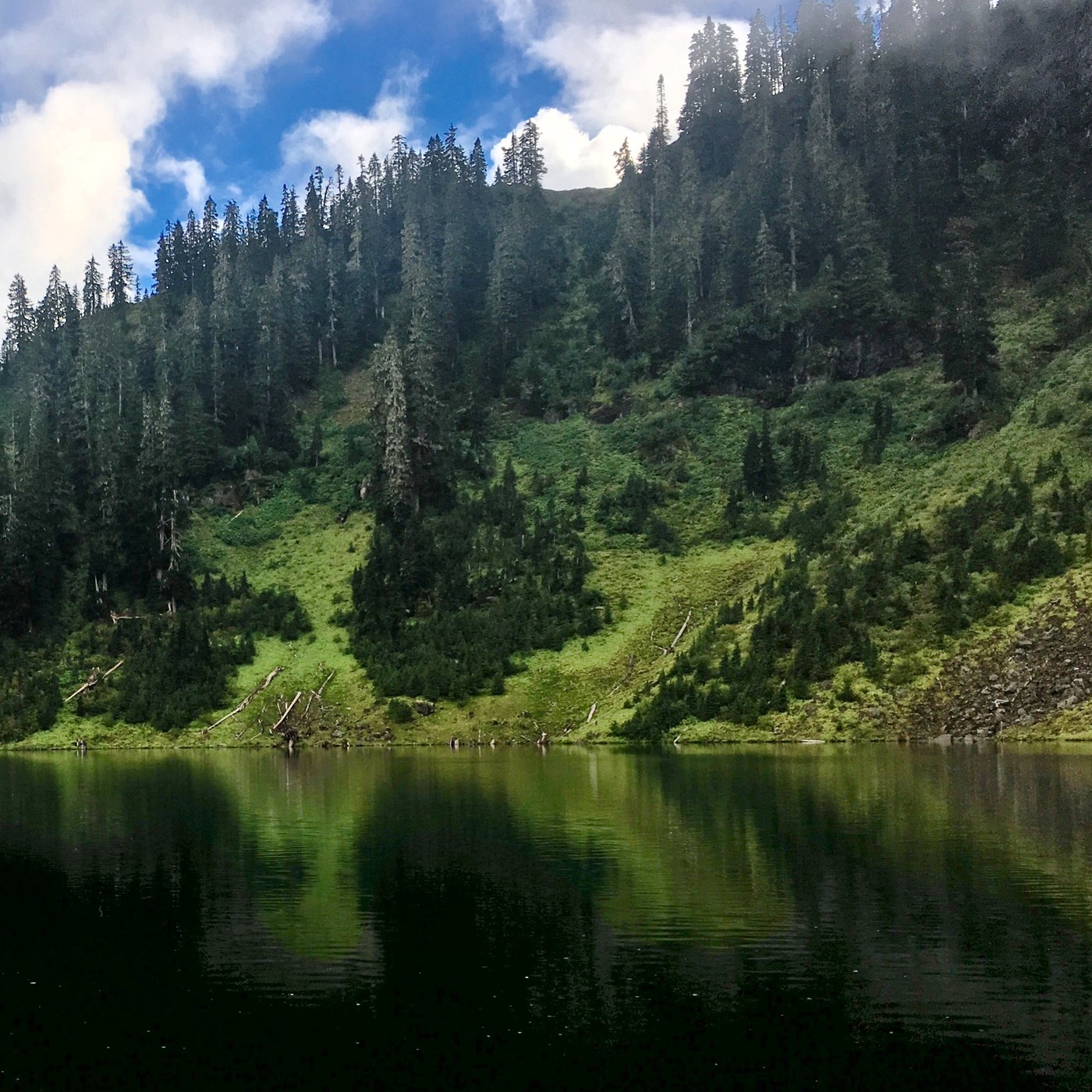 This trail is a great choice for a short family hiking outing. Our little group included my two-year old daughter and my 11 year old dog. Forest roads to the trailhead were in very good shape. From Bellingham this seems like a far drive, but in the end the mileage is only a bit further than the distance to Artist Point, with far less traffic once you leave Hwy 20. From the reports here and the write up in a hiking guide, I wasn't expecting the trailhead to be quite as busy as it was, though I'm sure the long holiday weekend was the contributing factor. We had a late arrival, so a lot of folks were coming off the trail and leaving as we got started. We arrived shortly before 1 pm, so after a picnic lunch at the car we headed out. Besides one blow down the trail to the lake was in great shape and it's a quick .75 mile walk. My daughter walked a good portion of the hike, though I put her back in the carrier for the short but tricky descent/ascent to and from the lakeshore. Tons of huckleberries and blueberries ripe for picking and snacking were a nice addition to the short hike. There were a few backpackers and day hikers at the lake, but we did get some quiet time in the grass by the shore for playing and casting some flies for brook trout. The weather was reasonably warm, with intermittent showers during our hike in and time at the lake. This lake is a beautiful little blue-green gem tucked in a small cirque. The other option this trailhead offers is a bit longer climb up to Dock Butte which apparently offers an excellent view of Mount Baker just to the north from an open alpine ridge. Given the rain and low cloud cover, we didn't pursue that option, though we'll definitely be back to explore that option in the future. It's very easy to incorporate both destinations into one relatively short, scenic and highly accessible day hike.