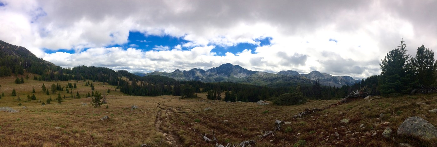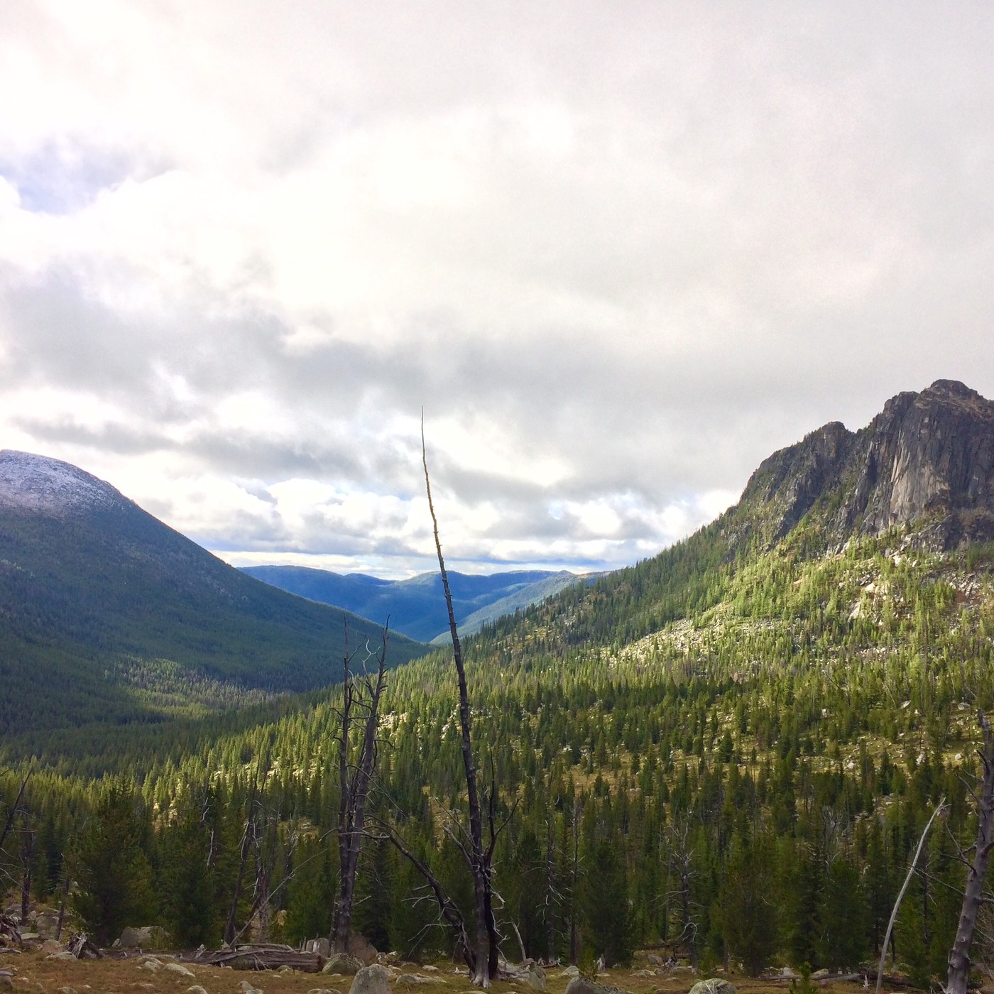 Day 4 - Night 3 was the coldest night and we awoke to a dusting of fresh now on the cliffs just above Cathedral Lake. We got an early start since it was so cold and we had about 12 miles ahead of us back to the horse camp. As we were leaving the lake towards Cathedral Pass we spotted a black bear and her cub just off the trail above us. They quickly noticed us and the cub ran away out of site. We observed from a distance and the mama bear kept her eye on us. We decided the trail went to close to her for comfort, so we cut the trail a little up to the pass to keep our distance. It was very windy at the pass with snow flurries. Once we descended on the other side, the wind died down. This was one of our favorite parts of the hike. The larch-covered slopes were beautiful with the cliffs of Amphitheater and Cathedral looming over us. I can only imagine how beautiful this area is once the Larch trees have turned more. The 5 or so miles to Tungsten Mine went by fairly quickly. Tungsten mine is a cool place and we met a couple of Boundary Trail thru-hikers there who had spent the night in the upper cabin the night before. The Tungsten Trail was not hard to find. It was a little swampy in some sections within the first 1-2 miles, then it was pretty easy going and went by quickly to the horse camp. One other group of 3 stayed at the camp this night as well. They had done the same loop we did, but camped at Remmel Lake on night 2, so it was fun to catch up with them. Also, we were starting to miss people at this point since we had seen so few on our trip.