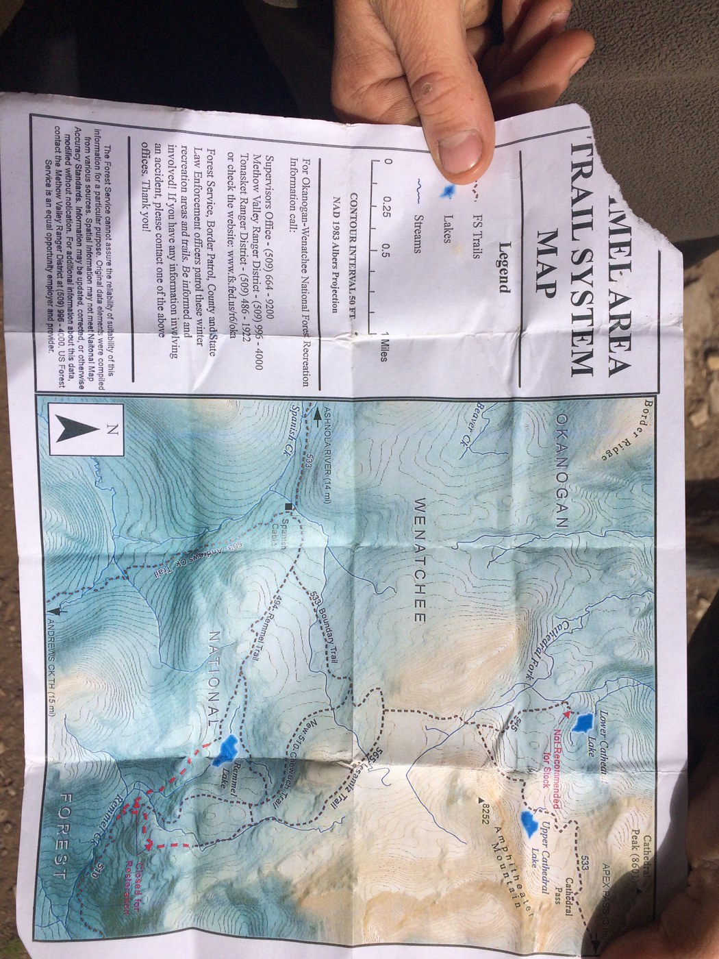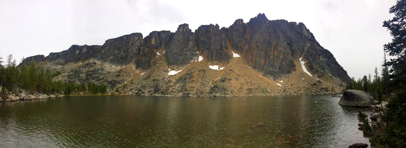 Day 2 - The original plan was to hike to Remmel Lake for night two, set up camp, then do a short hike to check out the old cabin at Spanish Camp. Once we were moving, we felt good, and decided to push all the way to Upper Cathedral Lake and do a longer day hike on day 3 to Spanish Camp without heavy packs. The trail is in good shape. Once we got near Remmel Lake, we became a little confused since we have the older Green Trails Map for the area. According to the WTA trail guide, the Green Trails map was just updated so be sure to check which version you have. We met some forest service guys on day 3, and took a picture of their up-to-date map of the area (see picture below). This should be helpful to you if you make this trek soon. Even though we were a little confused by the trails, we didn't have a problem staying on track to Upper Cathedral Lake. The trails are well-signed. We actually never saw Remmel Lake though. The pine forest gives way to a more moist sub-alpine forest as you climb higher towards Remmel. Then above Remmel you arrive to a truly spectacular tundra-like alpine setting. The trail stayed this way until we neared the cliffs and larch-covered sloped of Amphitheater Mountain. A couple guys bagging peaks in the area were packing up at Upper Cathedral Lake and pointed us to the best campsite near the middle part of the shore. We set up camp and settle into our home for two nights. There weren't more than a couple other groups at the lake each night and it is big enough that we never really noticed them. It definitely was a lot colder at Upper Cathedral than it was the night before at the horse camp. I'd guess it got into the mid-30s and it rained some on us. We did about 12 miles on day 2.