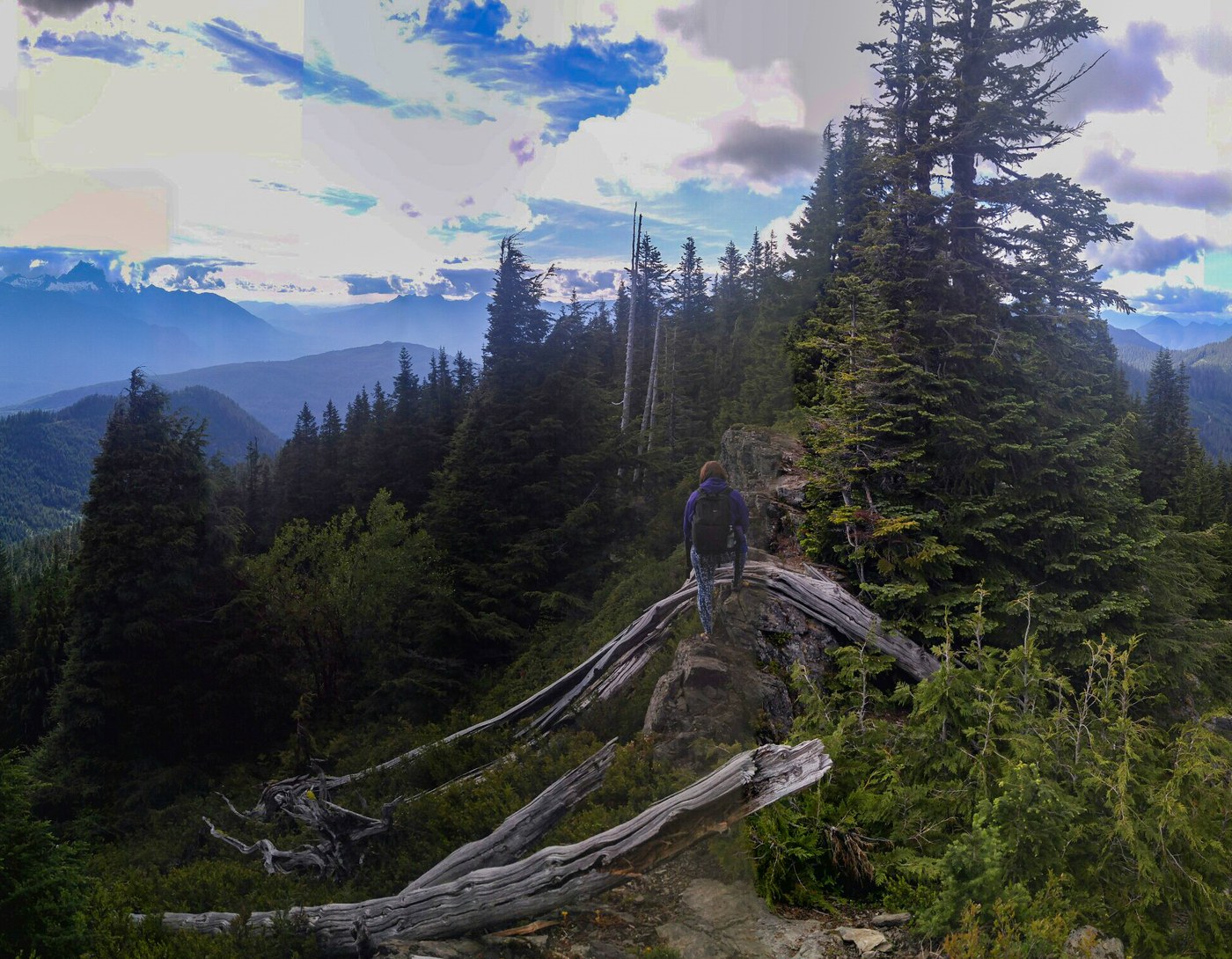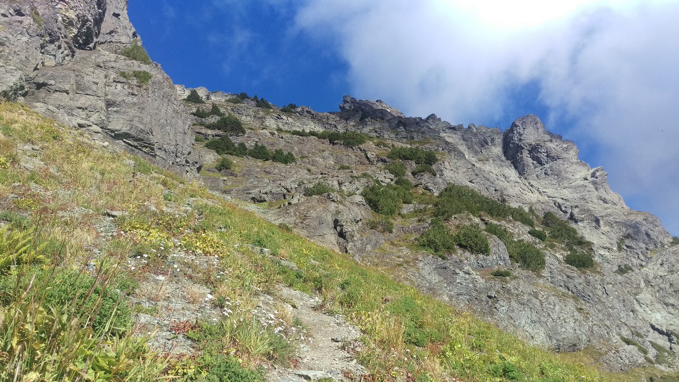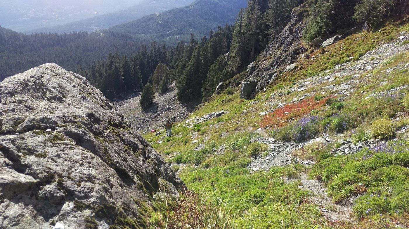 The trail follows a somewhat narrow ridgeline for about a mile before emerging into a meadow beneath the peak. Do note, the peak you approach from the west side is actually the false summit. When you hit the meadow at the base, keep following the trail and it swings you around to the south side, where you will encounter another meadow/talus, and you will be able to see the second higher, and true summit. Follow the rough trail through the talus to the gully between the two peaks. If you look upward, you will see a sort of channel in the gully, that's where you're headed. The talus has a very rough boot path that switchbacks up, make sure you have good footing because it's very "slick" when it's dry and there is dust. Eventually you'll get pretty high up in the gully, and a series of ledges begins to your right, and that's where the climb begins. We didn't go past here because we don't have any class 3 scrambling experience. From my understanding, there are down sloping ledges with some exposure and a downstep needed in the notch just before the summit. However, from where the ledges begin, it's not too far to the summit, so if you have the skills, you're almost there! We do intend to come back after doing a few training peaks first. Or if anyone is reading this and has the experience needed to summit, but would like company, let us know! We would love to join an experienced group, shoot me an email at brie.calvo@gmail.com. We have actually hiked the approach trail numerous times and know the area pretty well.