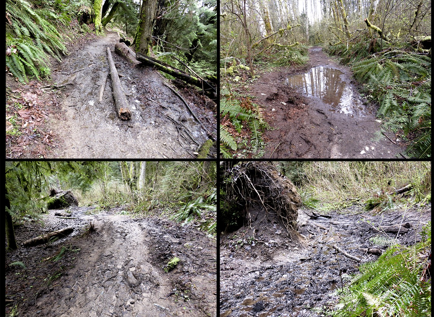 TRAIL ISSUES: 4 specific spots (see photo) that could really use some drainage work. Otherwise the hikers' workarounds will just keep making things worse.