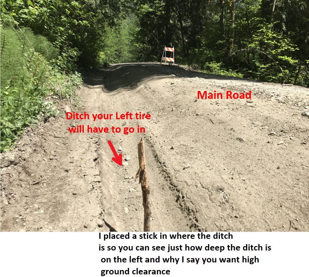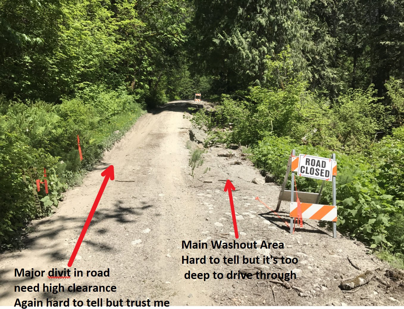 Forest road 49 or Sloan Creek/North Fork Sauk road is passable but is indeed damaged about .6 miles in from mountain loop highway. However, you will need a high ground clearance vehicle to make it. The road is washed out on the right-hand side, it’s about a 3-foot crater however it’s not so serious that I feel like driving over the road that’s still intact will cause someone to fall in. With that said there is one other problem. On the left-hand side of the road where the roads still intact there’s a huge ditch on the left that’s about 2 feet below the surface of the main road. So basically, your right tire is going to be way higher than your left one which will be way down in the ditch. This is why I recommend high clearance vehicle so you don’t bottom out. I know you can do it because I watched 2 pickup trucks do it today lol.
