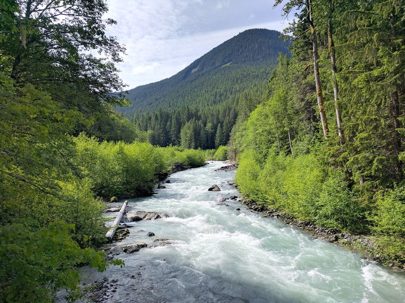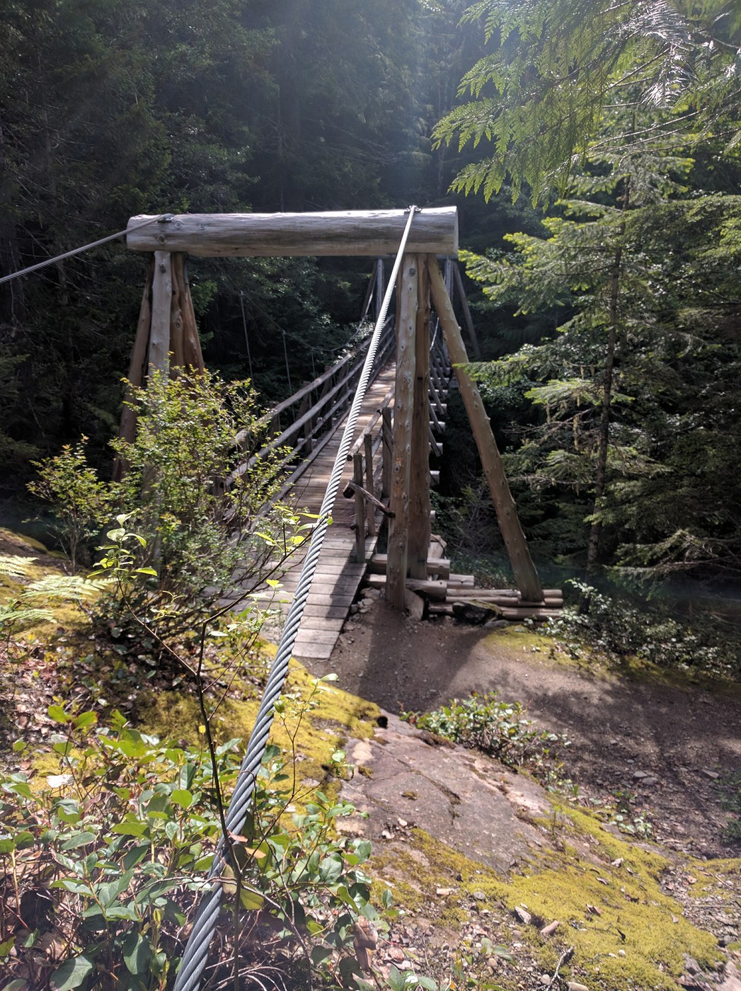 Otherwise, the trail passes through some lovely old growth, with regular views of the Suiattle below. No views of larger peaks. There are a few nice campsites on the way out, and when you get to the suspension bridge at Canyon Creek (about 6-6.5 miles in), there are campsites aplenty, on both sides of the creek. Another half mile or so and you arrive at, first, the PCT intersection, and second, the steel (beam) bridge spanning the Suiattle (as the PCT continues Southbound).