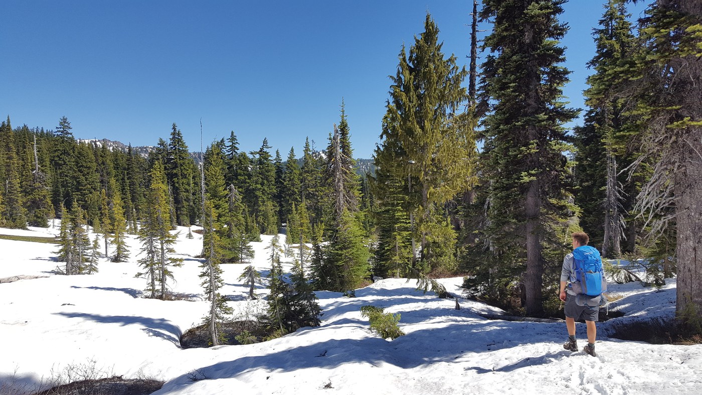 The trail was clear up until we crossed Goat Creek, where patchy snow began covering the trail pretty heavily. We were able to (kind of) follow the trail for another quarter-mile+ before it cleared up again for a short time at the hairpin-turn. We hiked up to the next creek (which was roaring) where the trail turns back to the N/NE. Since we were pretty determined to see how much snow there would be, we trekked up further until we reached a meadow. Right after this, the snow became really dense. There is a creek that runs into the meadow, so we decided to follow it up towards Snowgrass Flats. For the entire hike, the trail was not marked at all, and we were looking, but couldn't to find the "Bypass Trail No. 97/Snowgrass Trail No. 96" sign. We followed along the creek on top of the snow, and eventually made it to the lower part of open Flats. We ran into a couple others who had the same plan in mind, so we hiked up together, but ultimately decided to turn around and camp elsewhere for the night. Everything was still covered except for a few tree wells, and it would've been a blast trying to find dry wood for a fire haha. We hiked back down, and ended up camping down by Walupt Lake instead. It was a beautiful hike, but just not yet ready for backpacking unless you've got the gear to be on top of the snow.