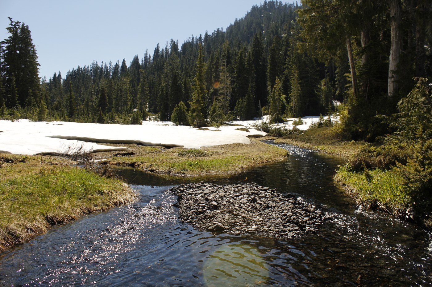 The road to the trailhead was in decent shape, although a vehicle with higher clearance would be better off with the high center of the road. We started from the trailhead at about 10am and got to the lakes between 2-2:30pm The trail is slightly eroded near the bottom but as long as you watch your step you’ll be fine. The trail is very easy to follow, with a few small snow fields, up to the meadows. The snow in the meadows give them a fairytale-esque look, so even if you aren’t sure about your ability to cross the chutes and snow fields beyond, you can still camp here and suffer through the inadequacies of the fairytale meadow.